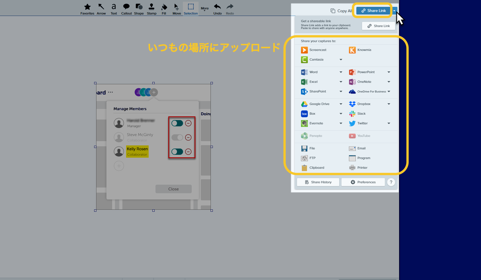 - リンクを共有:ドロップダウンメニューで簡単に共有先を選択。[共有] ドロップダウン メニューには多くのオプションがあり、ツールバーをカスタマイズしたり、プリセットを使用してすばやく共有したりすることも可能です。また、新しいリンク共有機能を使って、コンテンツをすばやくチームに伝え、即会話を始めることも可能です。