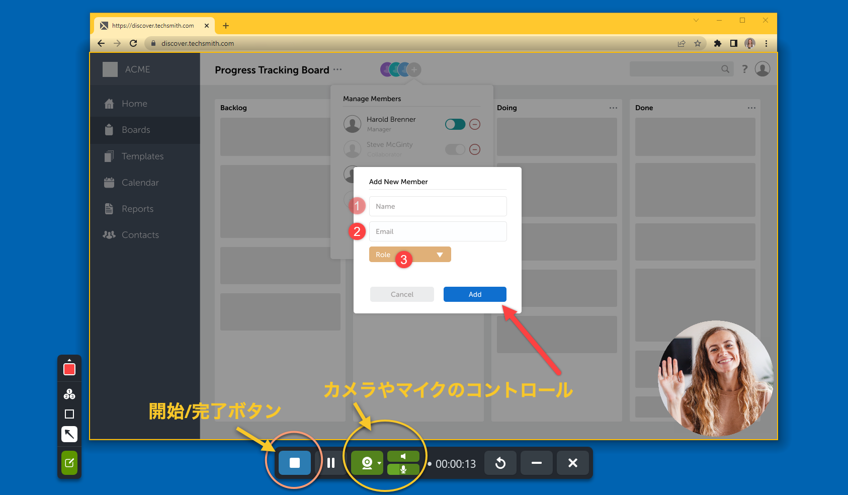 - 録画中の書き込み機能:画面を録画しながら、矢印、四角形、ステップ番号などの拡張機能を追加できます。色のカスタマイズも可能で、追加された項目はビデオの進行に合わせて自動的にフェード アウトします。