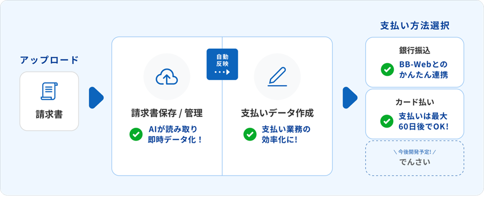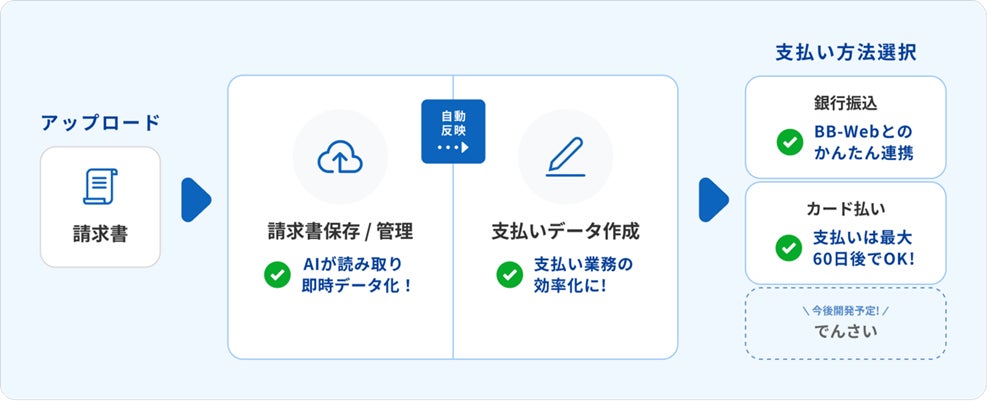 本サービスは、請求書管理(発行・保存)業務から、銀行振込等の支払業務、資金繰り予測が可能となり、お客さまの経理業務や資金管理業務の効率化に繋がるサービスです。