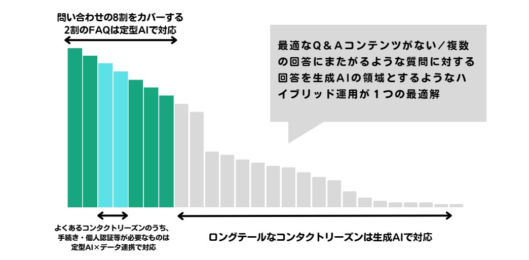 生成AIで回答する場合、テキスト生成に時間がかかるため回答速度が遅くなるというリスクがあります。ハイブリッド型で対応することで、個人認証が必要なものは従来型のAIチャットボットが答えるなど、顧客を待たせることなく、スムーズに自動返答・手続きができる環境を整えます。