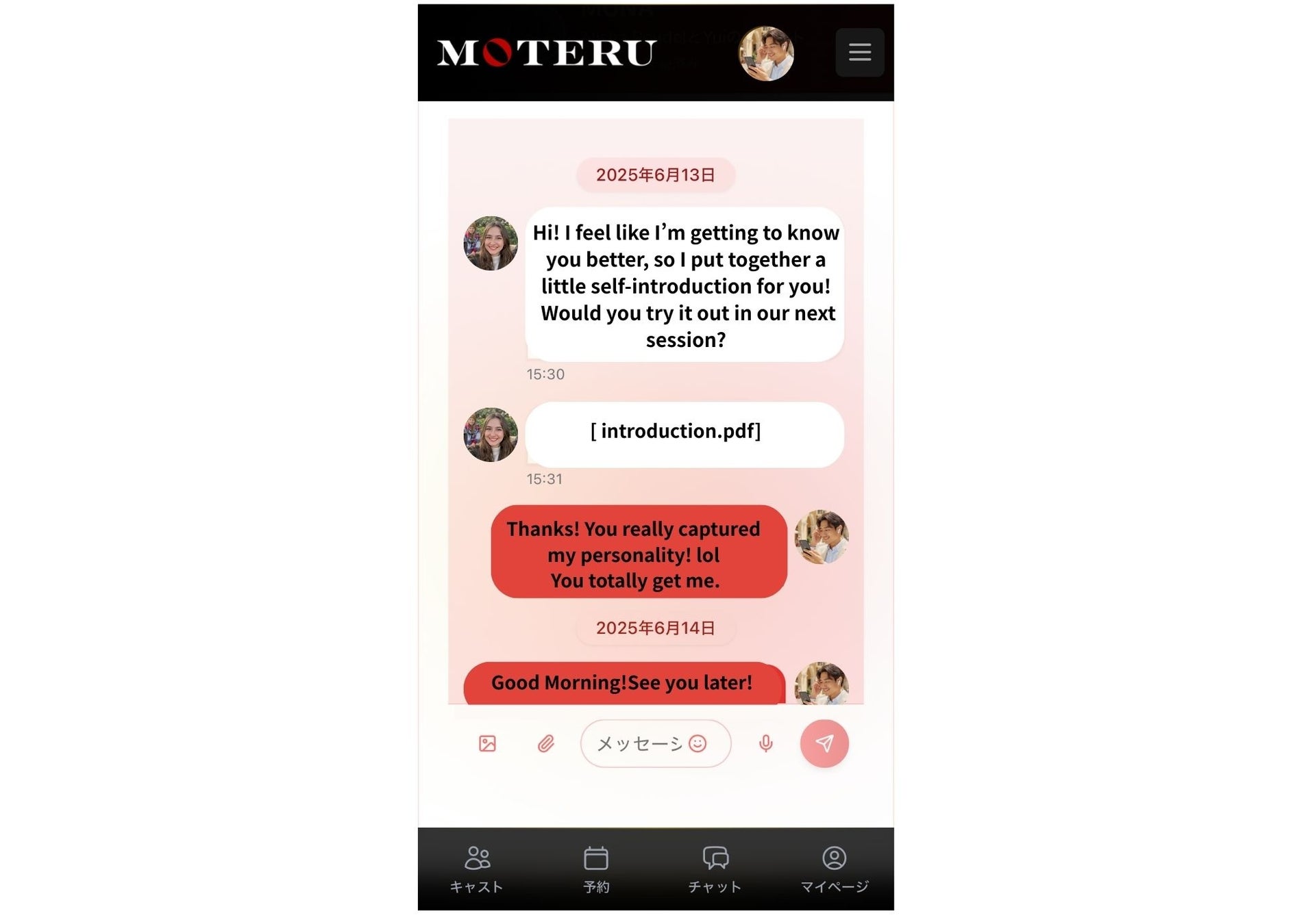 海外女性との恋愛トークを入り口に、世界でモテる自分にアプデするミッションリア型英会話『MOTERU』、PDFなど資料の“ファイル送受信”が可能に。学びに役立つコンテンツがトークの充実度を向上