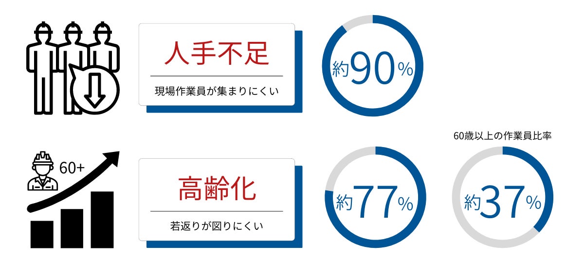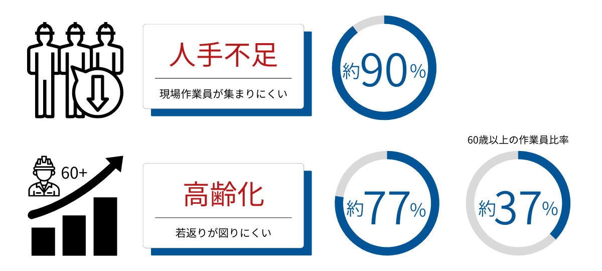 現場担当者の悩みごとのトップとして現場作業員の不足があります。89.7%が「現場作業員が集まりにくい」と回答しており、慢性的な人手不足を解消することが非常に難しいことが分かります。ほかにも、60歳以上の作業員比率は約37.2%以上となっており定年退職の対応が必要となりますが、約77.2%の担当者からは「現場従業員の若返りが図りにくい」という悲観的な回答が出ており、抜本的な改善までは時間を要することがうかがえます。(※1)