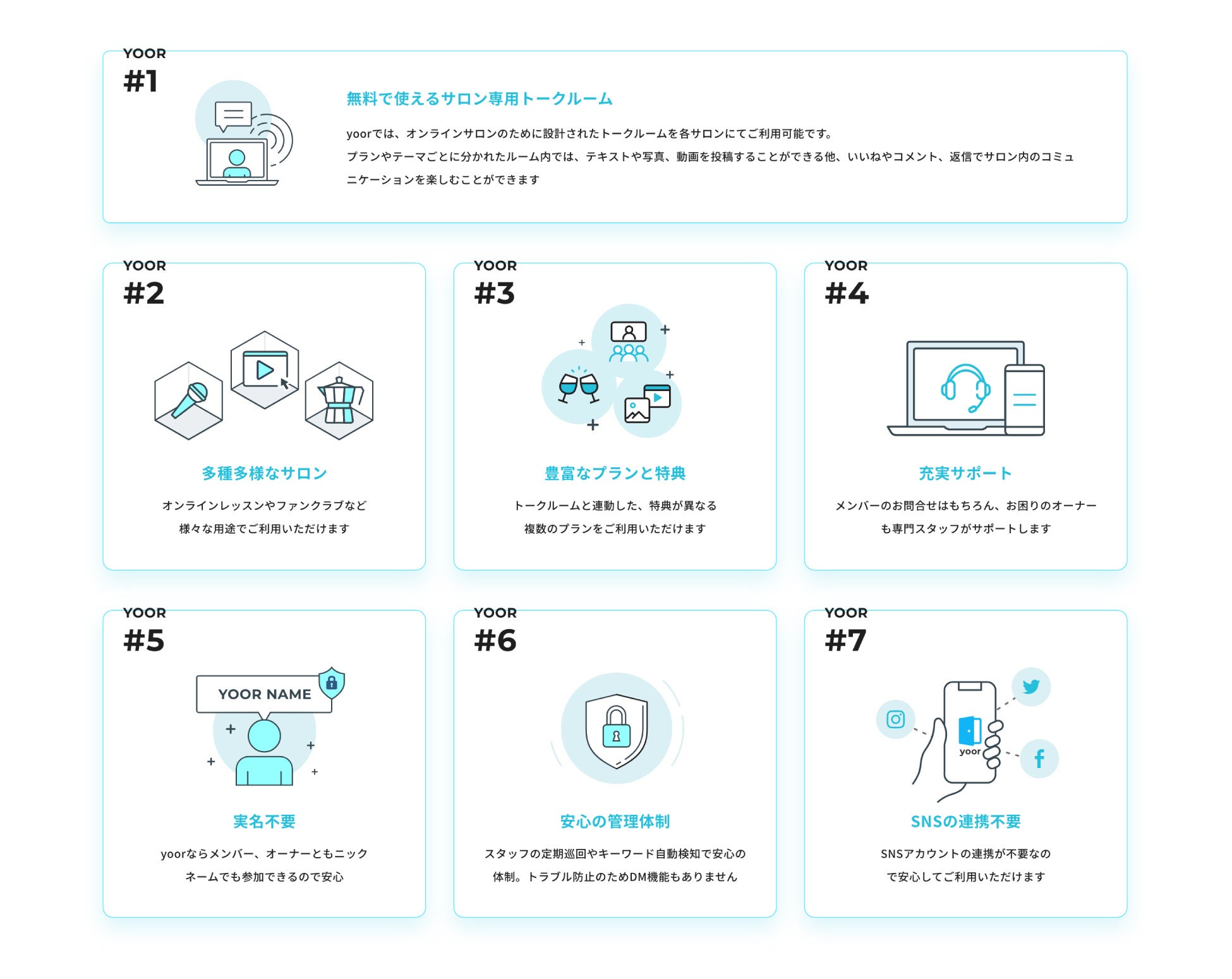 yoorは誰でも気軽に利用できるオンラインサロンプラットフォームとして、同じ価値観を持つ仲間やファンと安心してつながり、みんなが輝ける場所作りを目指してまいります。