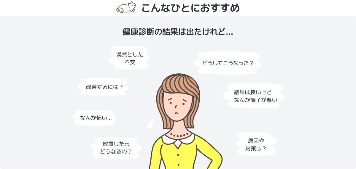 手元の健康診断結果にはアルファベット記号による判定結果と、検査項目の異常値を示す赤い数字と、再検査を促す文言があるのみで、それがどの程度の深刻度を示しているのかであったり、具体的にどのような症状が現れる可能性があるのか、そして、どのような病気の可能性を示唆する結果なのか。自身の状態と生活リズムに合った適切な予防法や、生活改善のきっかけとするには、十分な手がかりを得られない状態が考えられます。
