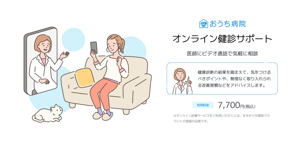 健診サポートは、おうち病院の医師とのオンラインビデオ通話を通して、健康診断の結果に対する疑問や不安を、病院に出向くことなく解消するとともに、それぞれに適した行動を確認していただくために開発した新サービスです。