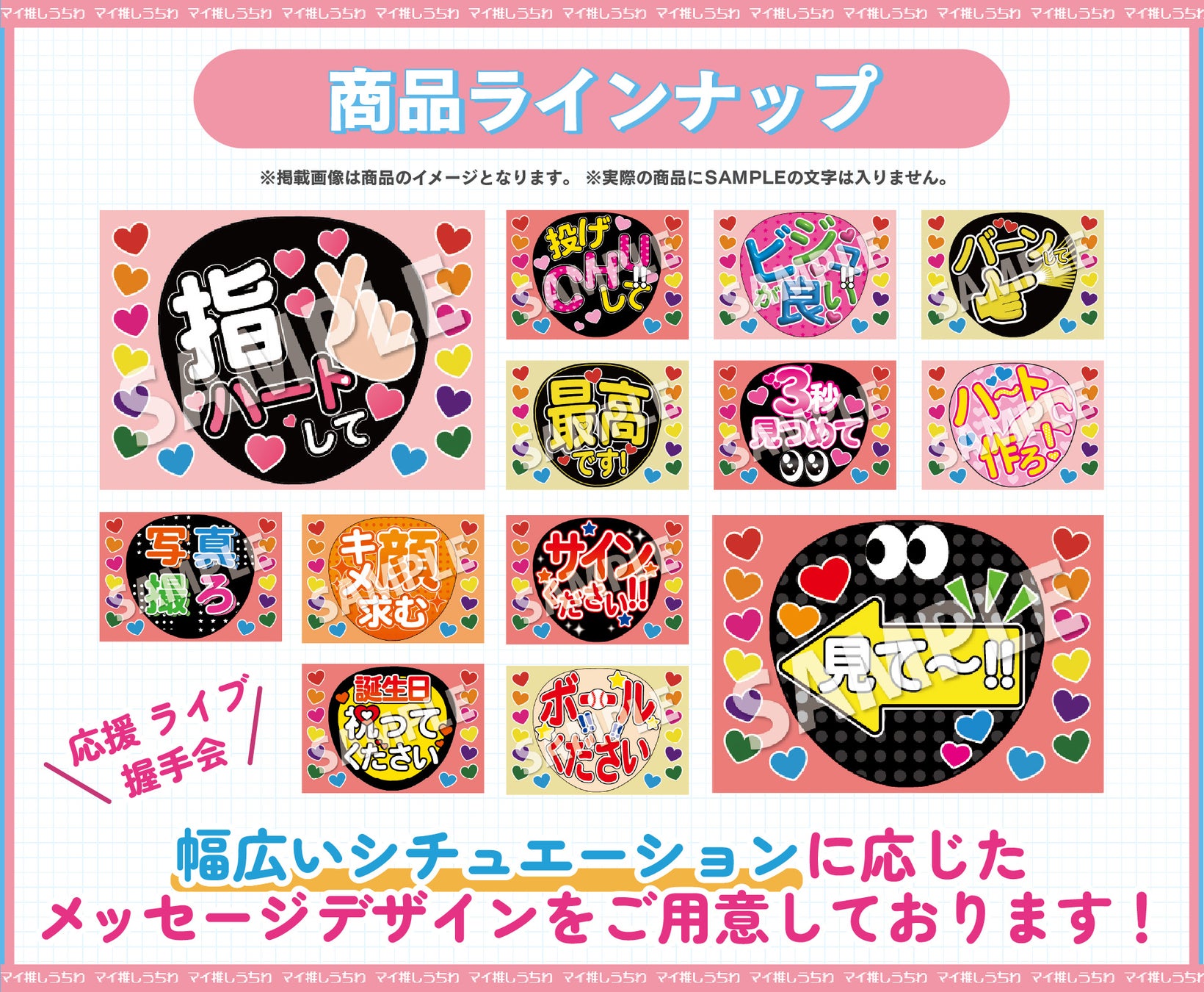 ライブや握手会、コンサートでの応援など、幅広いシチュエーションに応じたメッセージのデザインをご用意しております。