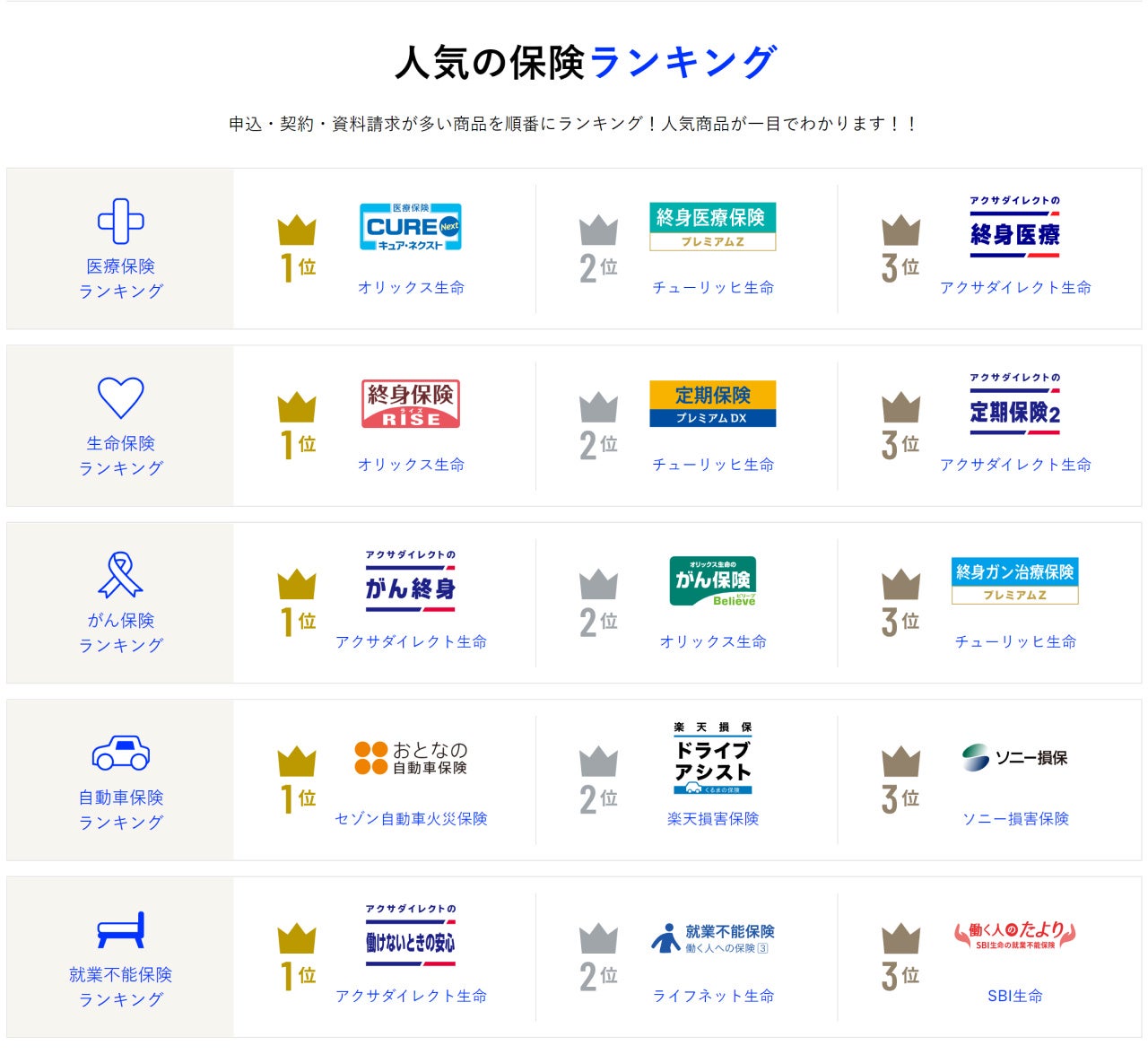 調査目的:各種保険の人気調査(契約数・資料請求数・閲覧数の多い順に作成)