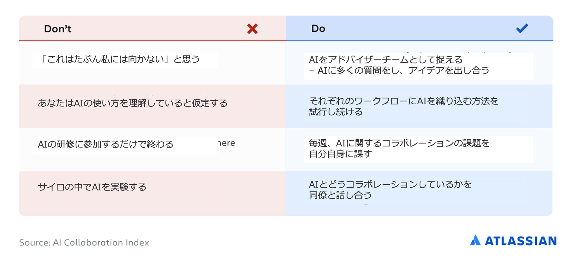 AI コラボレーションに焦点を当てた部門横断的な学習セッションを開催する:チーム全体会議に、各自が業務改善に AI を活用している方法を紹介するセグメントを追加することを検討する。これを持ち回り制にする。各自が事前に AI コラボレーションのベストプラクティスを共有するよう求められていることを知っていれば、AI とのより良い関わり方を確立し、採用する可能性が高まります。