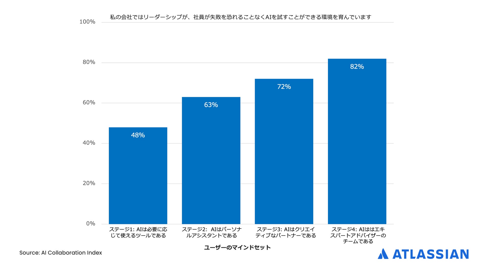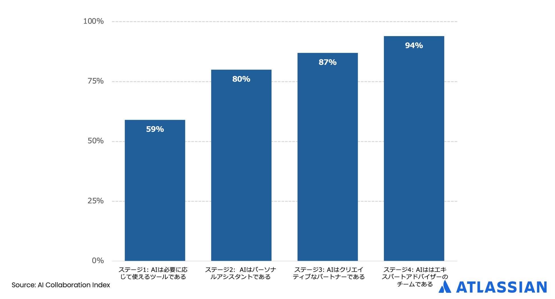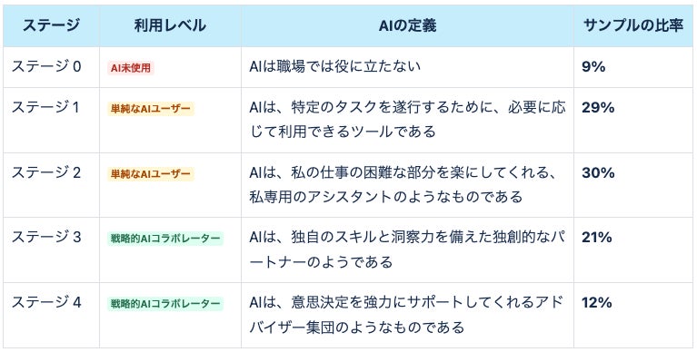 ステージ4のAIコラボレーターのほぼ全員(94%)が、AIとの協働を学ぶために費やした時間は報われると同意しているのに対し、ステージ1のAIユーザーでは59%にとどまっています。