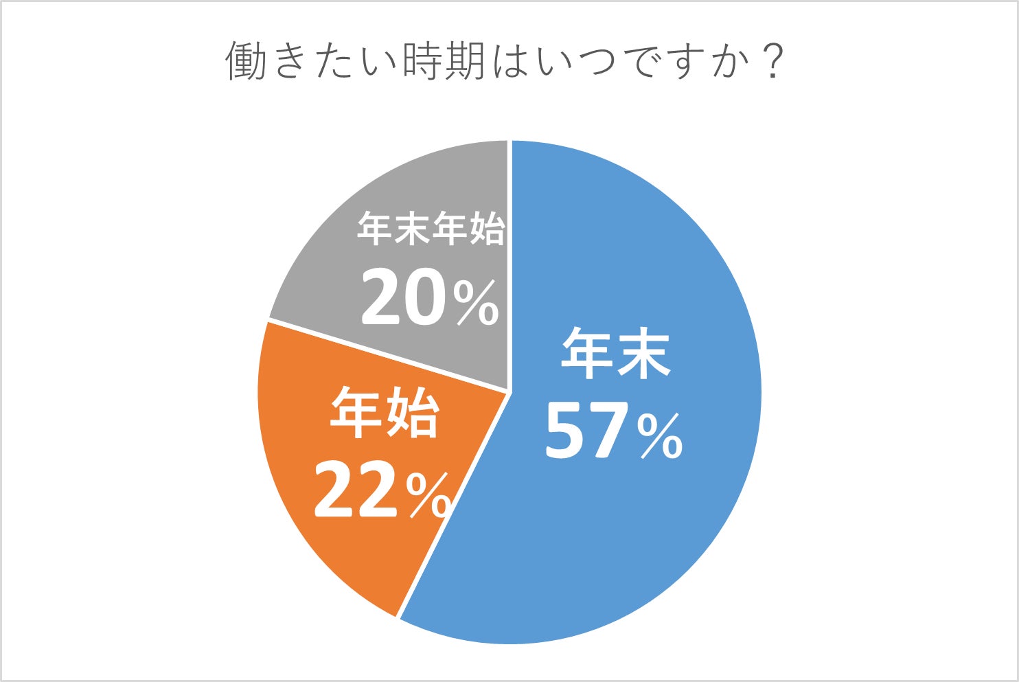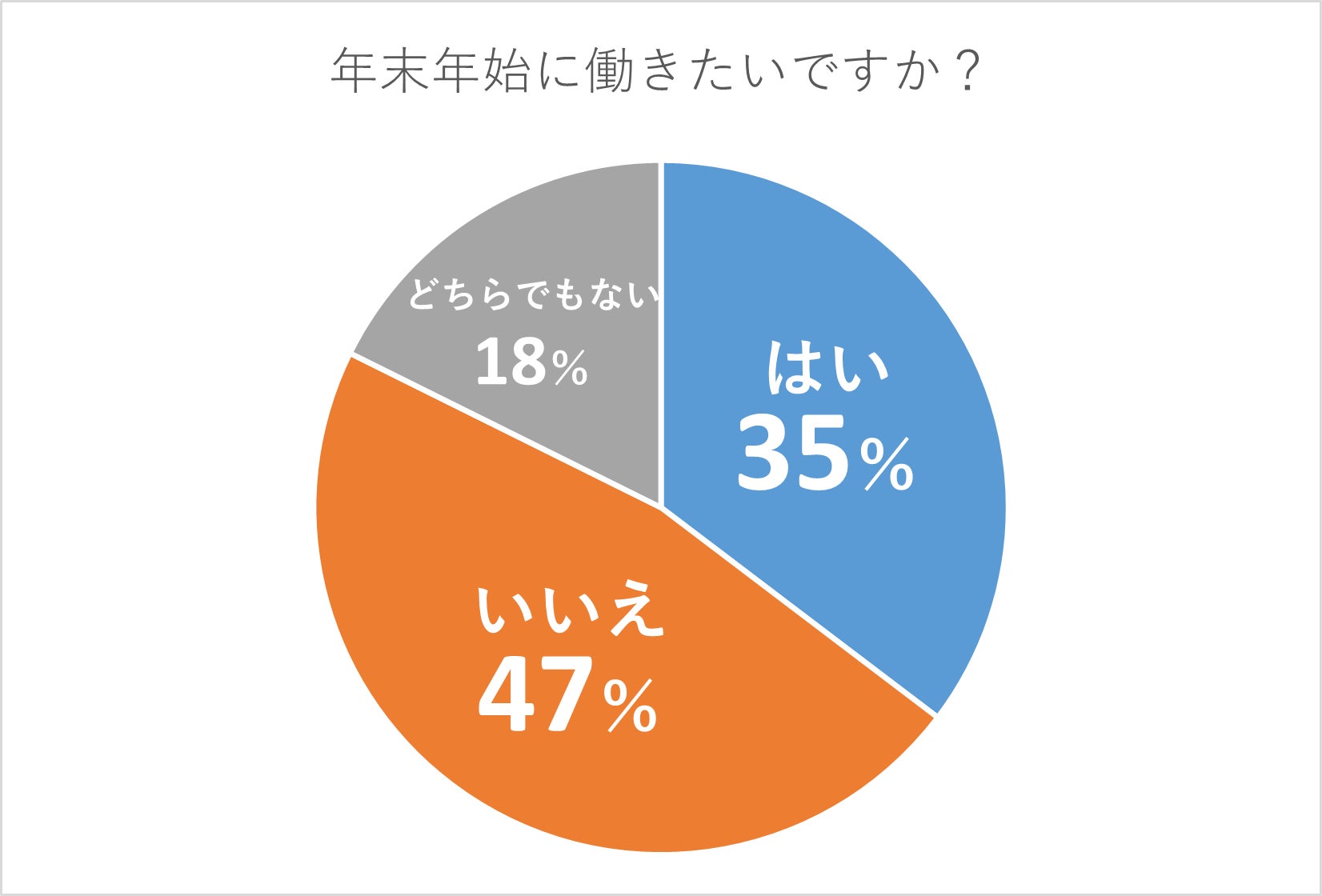 今回の調査では、35%の人が年末年始でも働きたいと回答しました。原材料の高騰などで生活への影響が関係していることが予想されます。求人企業側はニーズが無いとして年末年始の求人募集を控える傾向にありますが、労働者側ニーズは健在だと言えます。