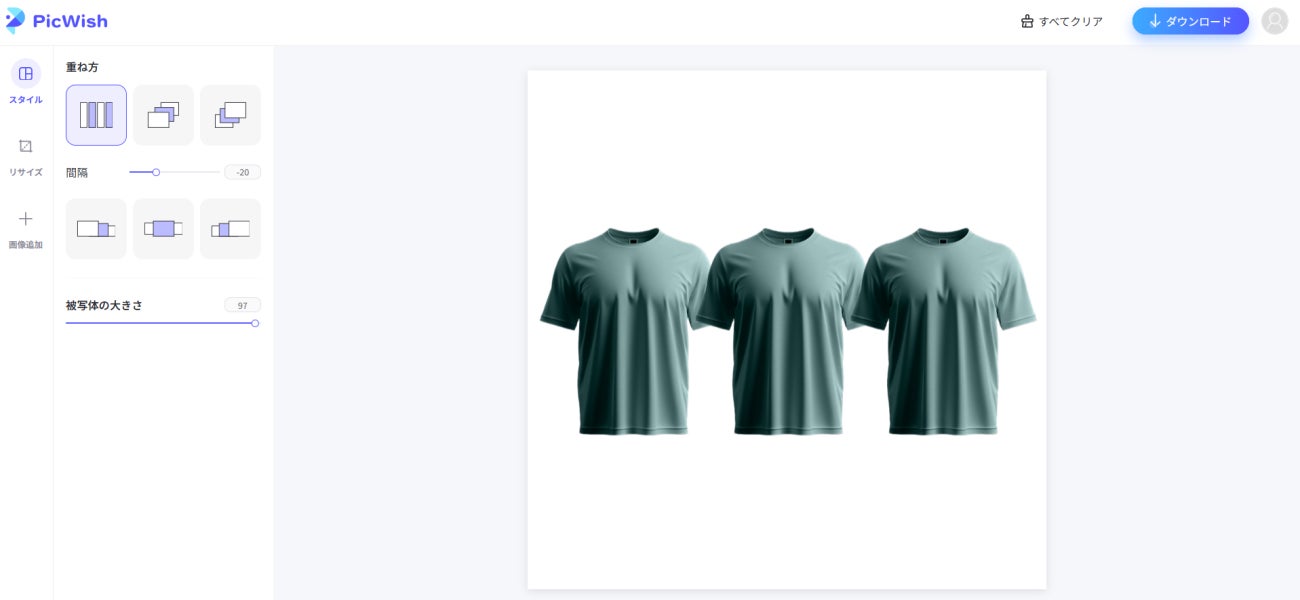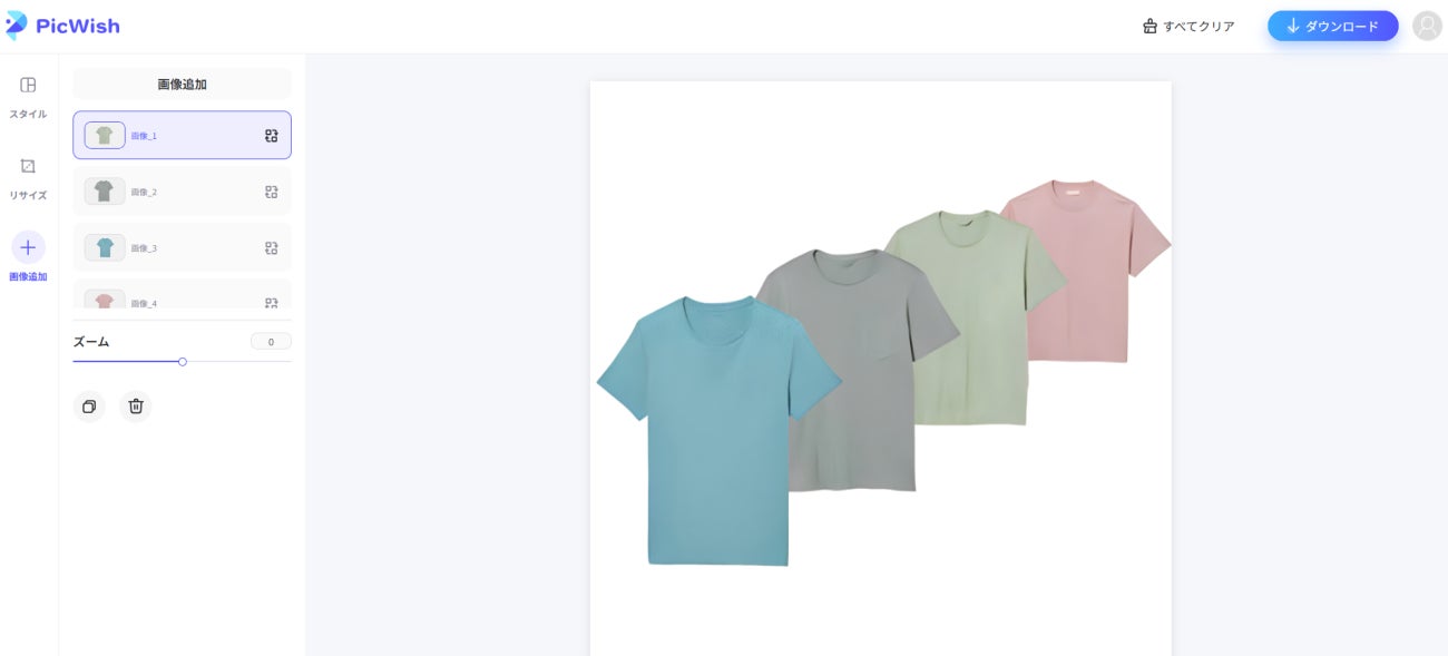 例えば、同じデザインのTシャツが10色展開している場合、「製品コラージュ」機能を使用することで、全ての色のTシャツを1枚の画像にまとめて表示できます。これにより、購入者は一目で利用可能な全てのカラーオプションを確認でき、購買意欲の向上につながります。