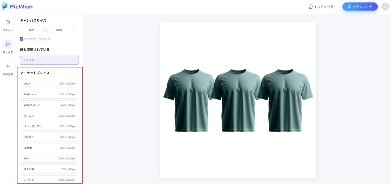 主要ECプラットフォームへの対応:メルカリ、Amazon、楽天市場、eBayなど、日本の主要ECサイトに最適化された画像サイズプリセットを用意しています。