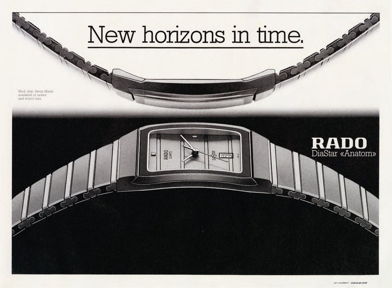 当時、アナトム制作時、デザインの着眼点としてバランスを主要なポイントに捉えていました。腕に直接着用すること、「人体の構造学的」に自然に腕に密着するものを見出せるように集中し、またタイムピースとしての外装へのこだわりも、新しい方向へ向かうべく限界をさらに広げて取り組んだといわれています。ラドーの時計職人たちの探究心は見事に実を結び、これまでにない、新たな凸型(ドーム型)のサファイアクリスタルをつくりだし、ブレスレットやケースの留め具にも新たな流線形を見出しました。この「アナトミック=人体構造学的に」がまさに必年的なキーワードの時計つくりとして、仕上がりました。斬新で、美しいこれまでになかったタイムピース、まさに、アナトムの誕生秘話です。