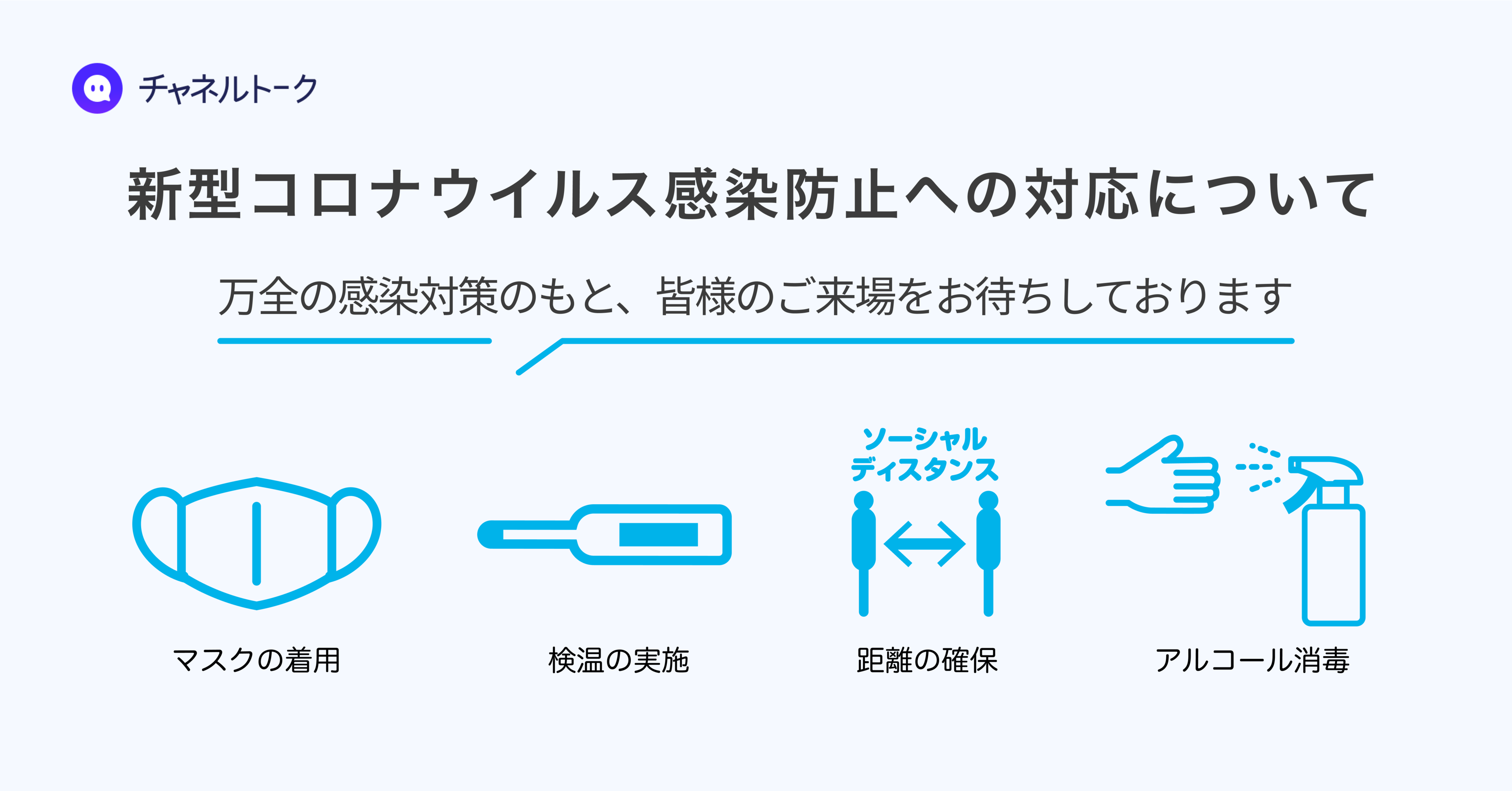 チャネルトークのブースでは、以下の内容を実施し、新型コロナウイルス感染防止に努めます。