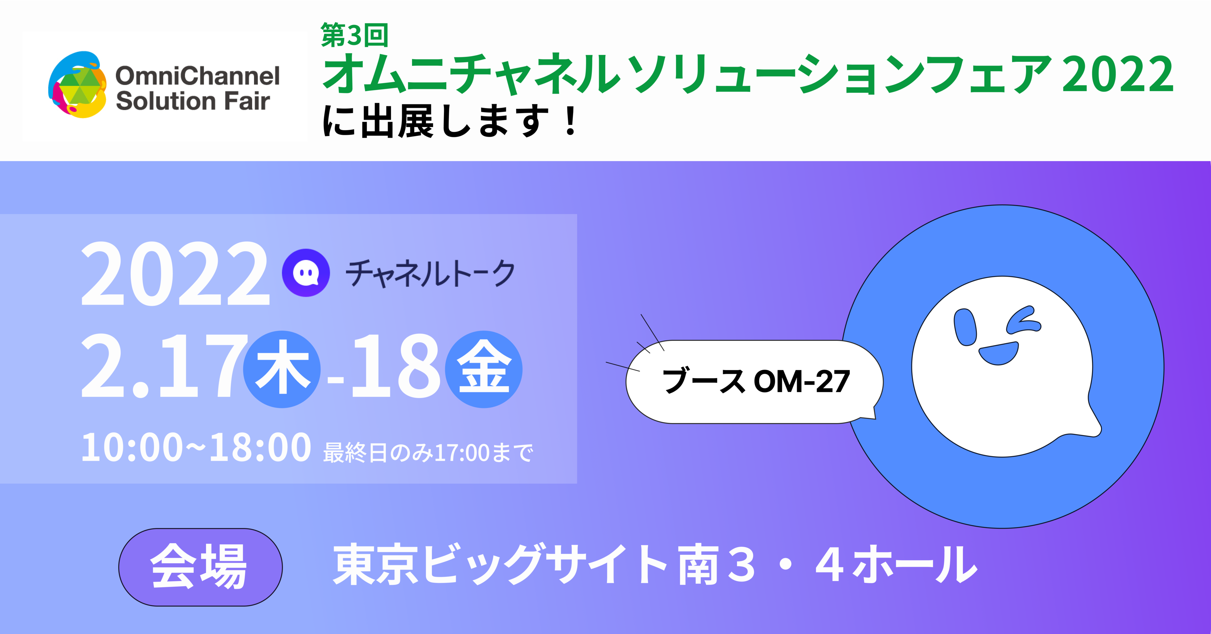 オムニチャネルソリューションフェアは、「イーコマースフェア東京」「マーケティングテクノロジーフェア」「コンテンツマーケティングジャパン」を同時開催する、日本最大級のオンラインビジネス関連展示会です。本展示会では、オムニチャネルの仕組み作りから最新事例の発表まで、オンラインとオフラインの融合を加速させる製品・ソリューションが一同に出展します。当社のブースでは、「チャネルトーク」について下記のポイントをご紹介します。