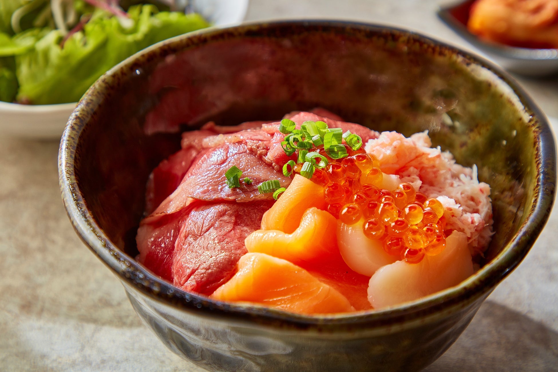 神戸ビーフといくらや帆立などの魚介を合わせた豪華な丼ぶりのお膳です。日本らしい華やかさを表現しました。