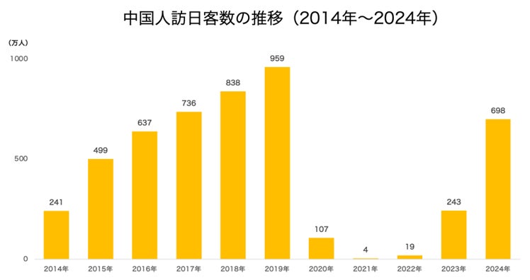 その後、コロナ禍の影響で大きく減少も、海外団体旅行の解禁や日中間航空便の再開に合わせて、2023年から訪日客数が回復。2024年は698万人に。