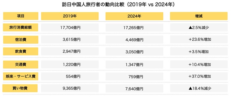 特に娯楽・サービス費は+37.0%と大幅に伸びており、「爆買い」から“体験・満足度重視”の旅行スタイルへとシフトしている。