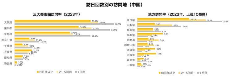 中国人訪日客においては、訪日回数の増加とともに、東京・大阪といった主要都市の訪問率は低下し、福岡・沖縄・滋賀など地方エリアの訪問率が上昇傾向。