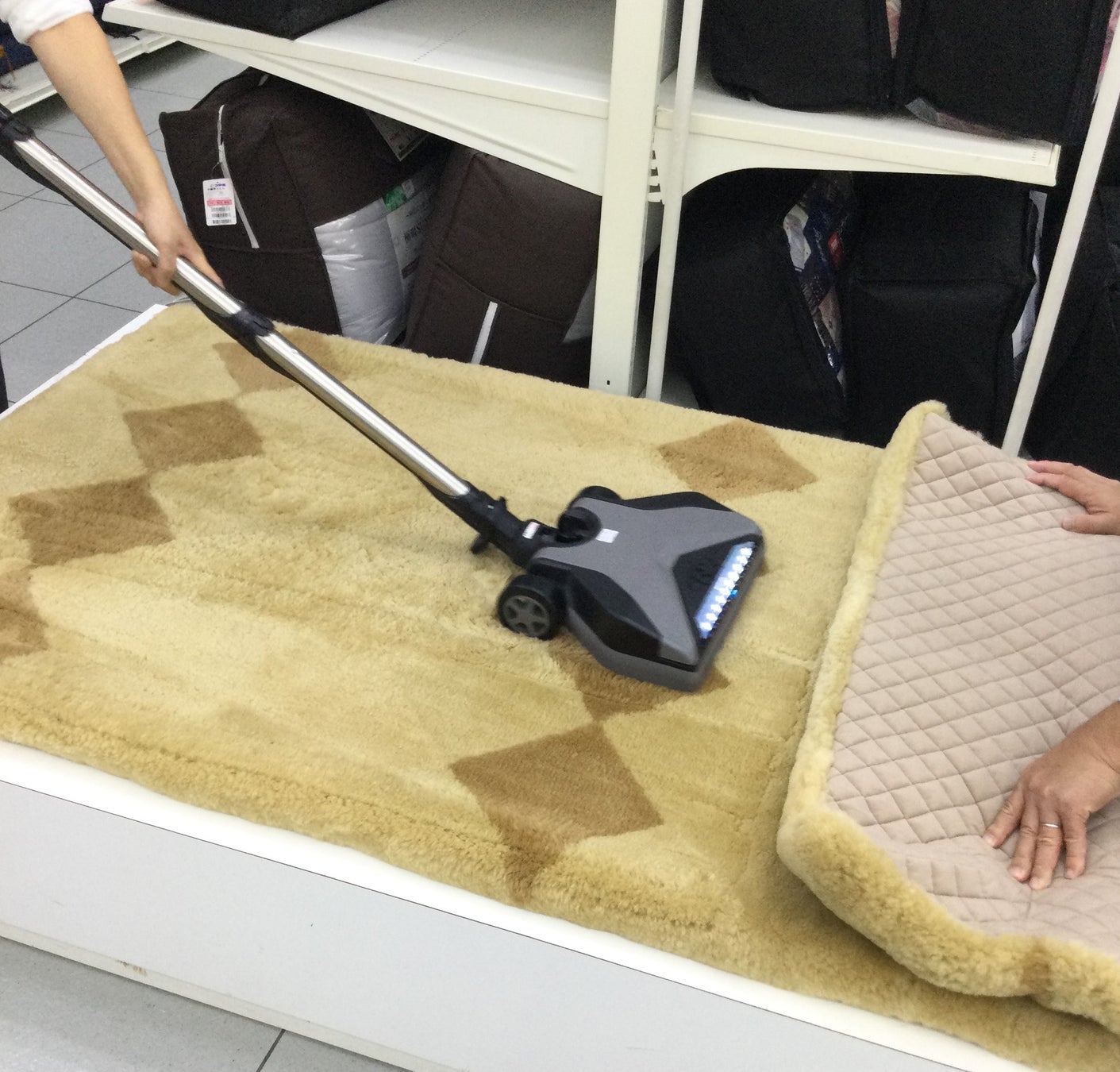 ムートンシーツは長年使用し付着した通常では取れにくいほこりや皮脂などを、まず専用の掃除機で綺麗にお掃除。そして仕上げに「ブラッシング(毛起こし)」を行い、表面の毛並みを均等に整えます。