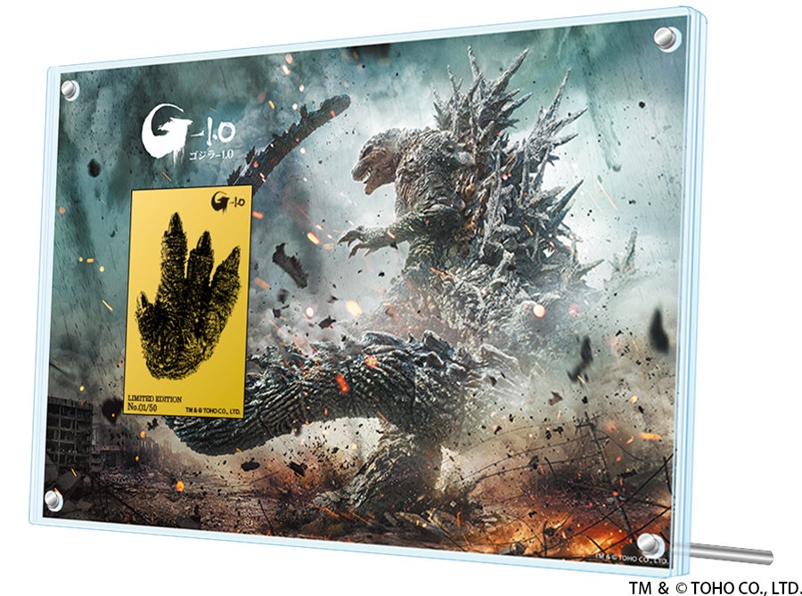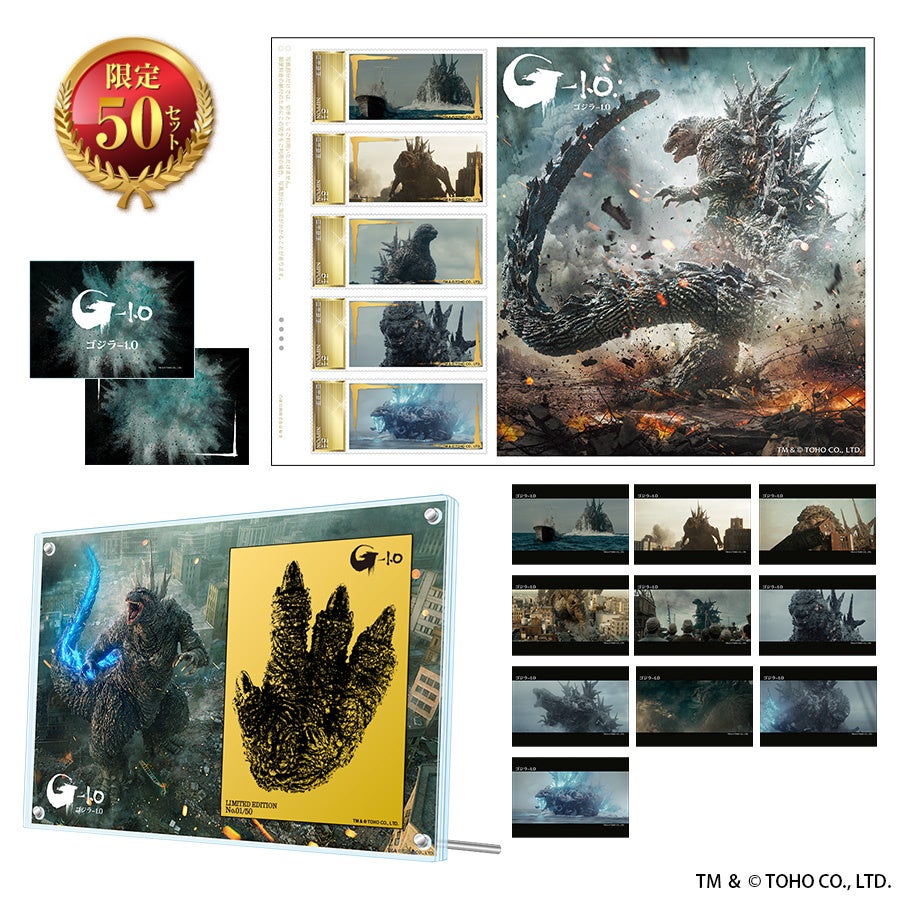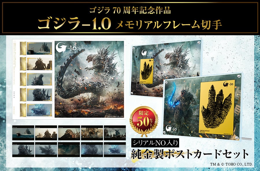 ゴジラ70周年記念となる本作は2024年に数々の権威ある映画賞を受賞するなど、ゴジラの歴史に新たな記録を刻みました。それを記念し、シリアルナンバー入り豪華純金製のポストカードを同梱したメモリアルフレーム切手セット(限定50セット)等を数量限定にてご用意致しました。