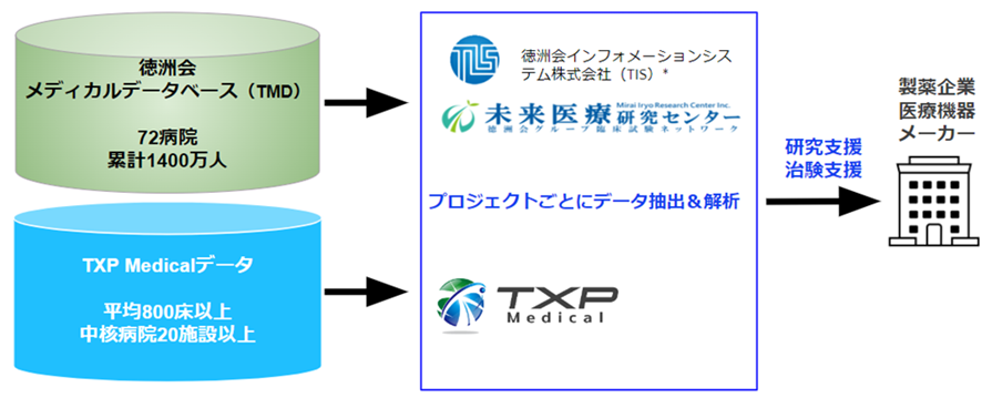 当社は、徳洲会グループの一員として、「いつでも、どこでも、だれもが最善の医療を受けられる社会」を目指すというグループ理念の元、弛まぬ活動を続けています。現在までに、徳洲会メディカルデータベースを利活用したリアルワールドデータベース研究が30件以上実施されてきており、その研究成果は、医療業界の発展に貢献してきております。今回、TXP Medicalとの協業により、お互いの関係するリアルワールドデータから、共同のデータベース研究としてデータを提供するインフラを提供致します。従来にも増して、製薬企業及び医療機器メーカー等に対して、より優れた医療サービスに貢献できる環境づくりに邁進する所存です。
