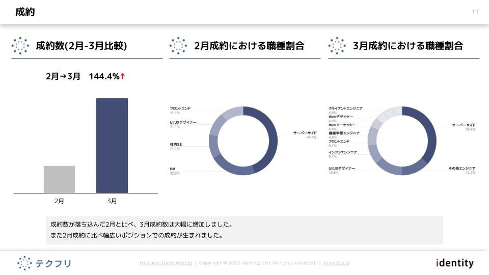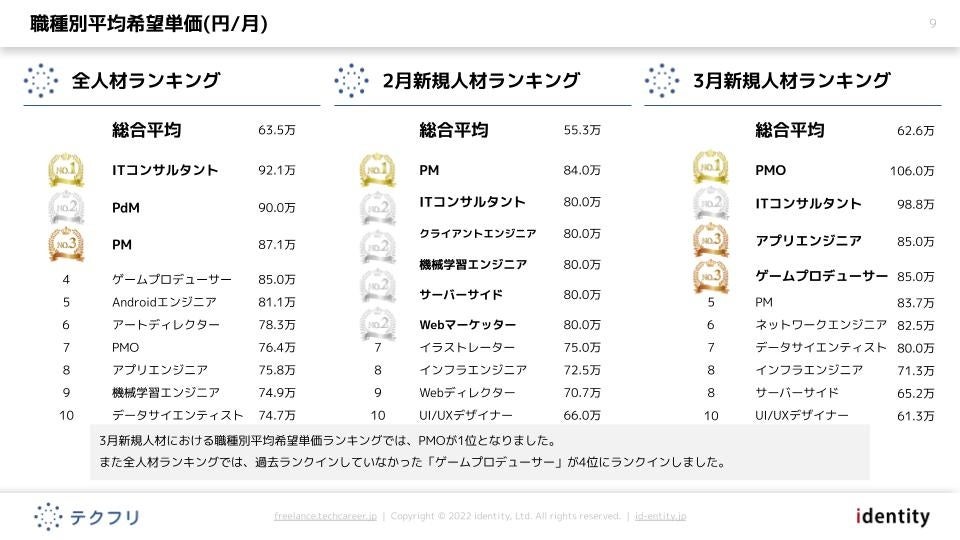 ITフリーランスエンジニアの案件・求人サイト「テクフリ」(https://freelance.techcareer.jp/)を運営する株式会社アイデンティティー(東京都新宿区、代表取締役:今野 力、以下「当社」)は、テクフリのデータベースを元に2022年3月における人材の市況感を調査しました。より詳しい結果については、お問い合わせからダウンロードいただけます。