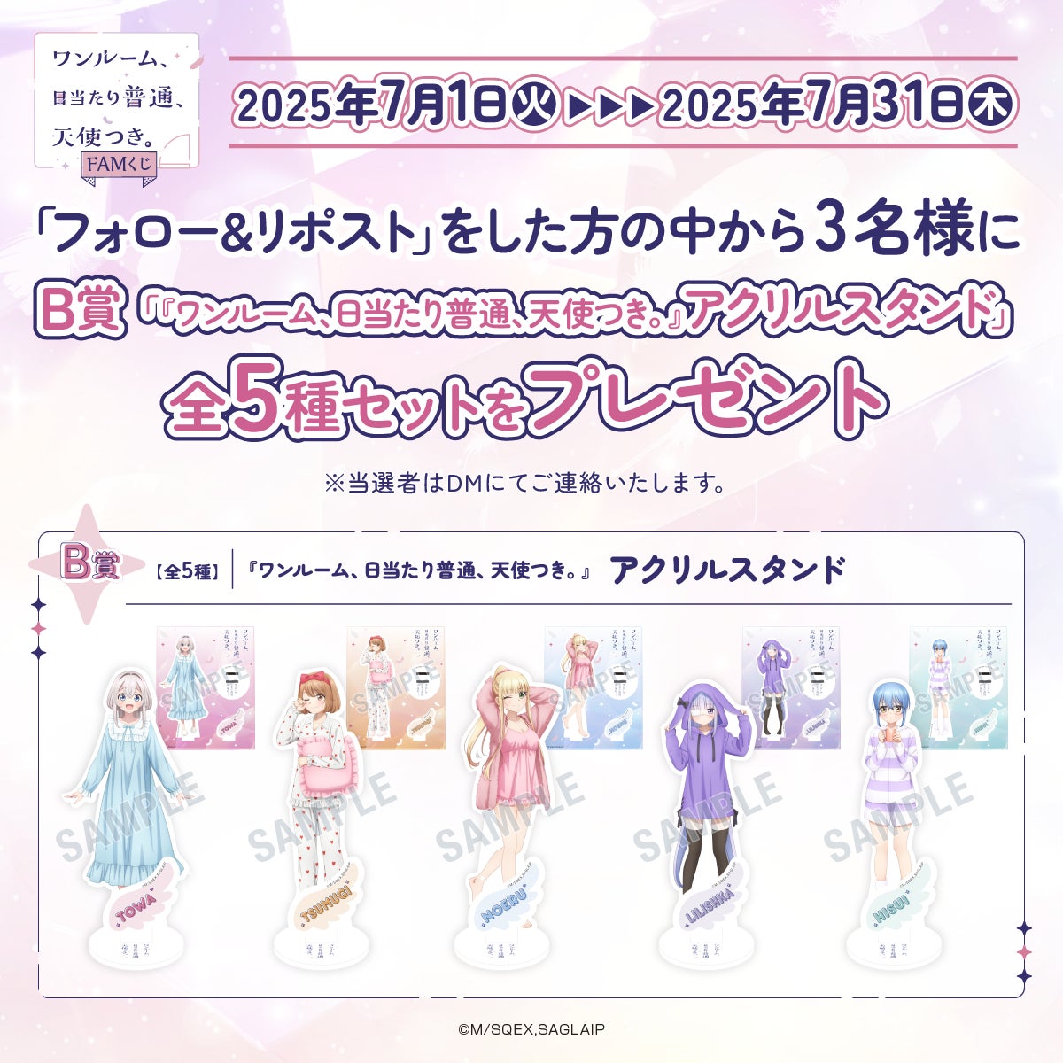 期間中に「FAMくじオンライン」の公式Xアカウント(@FAMKUJI_ONLINE)をフォローし、キャンペーン投稿をリポストすることで、抽選で3名様にB賞の「『ワンルーム、日当たり普通、天使つき。』アクリルスタンド 全5種セット」をプレゼントいたします。