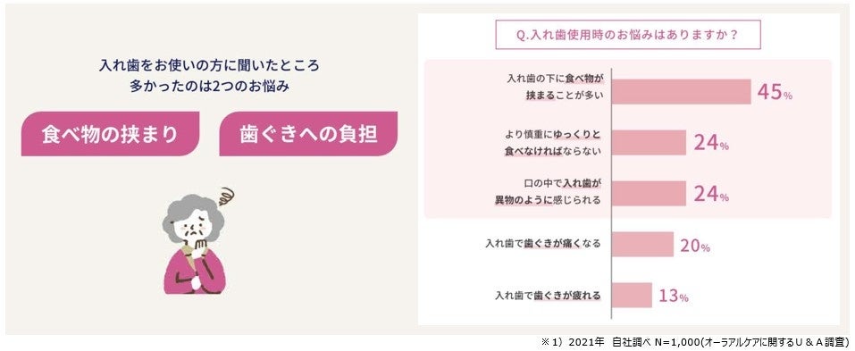 入れ歯をお使いの方を対象にしたアンケート調査※1によると、最大の悩みは「入れ歯の下に食べ物が挟まることが多いこと」が45%、次いで食事中に「より慎重にゆっくりと食べなければならない」が24%、さらには「口の中で入れ歯が異物のように感じられる」が24%や「入れ歯で歯ぐきが痛くなる」が20%、「入れ歯で歯ぐきが疲れる」が13%でした。