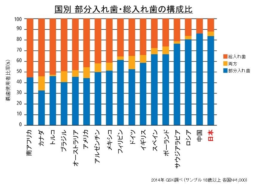 日本における義歯使用者の8割以上は部分入れ歯を使用であり、世界的に見ても部分入れ歯の比率の高さが際立っています(2014年 GSK調べ)。