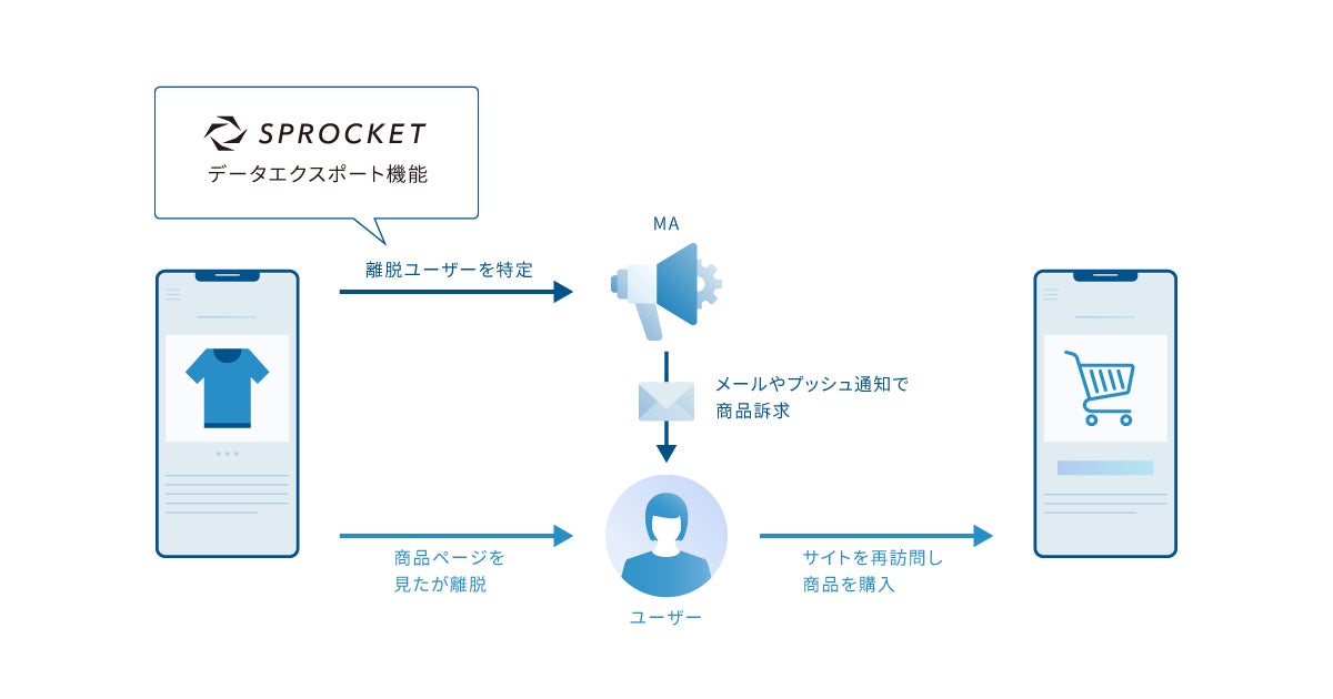 「データエクスポート機能」は、Sprocketが取得している「ページを見る」「スクロールする」「クリック(タップ)する」などの、ユーザーがWebサイトやアプリで取った行動の各種データを外部出力する機能です。
