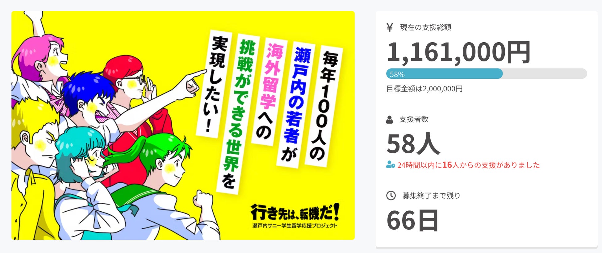 瀬戸内・中四国の若者が海外留学に挑戦できる世界を実現するべく、海外留学事業「行き先は、転機だ!」のクラウドファンディングを実施中。公開3日で目標額100万円を突破し、多くの応援をいただいております。