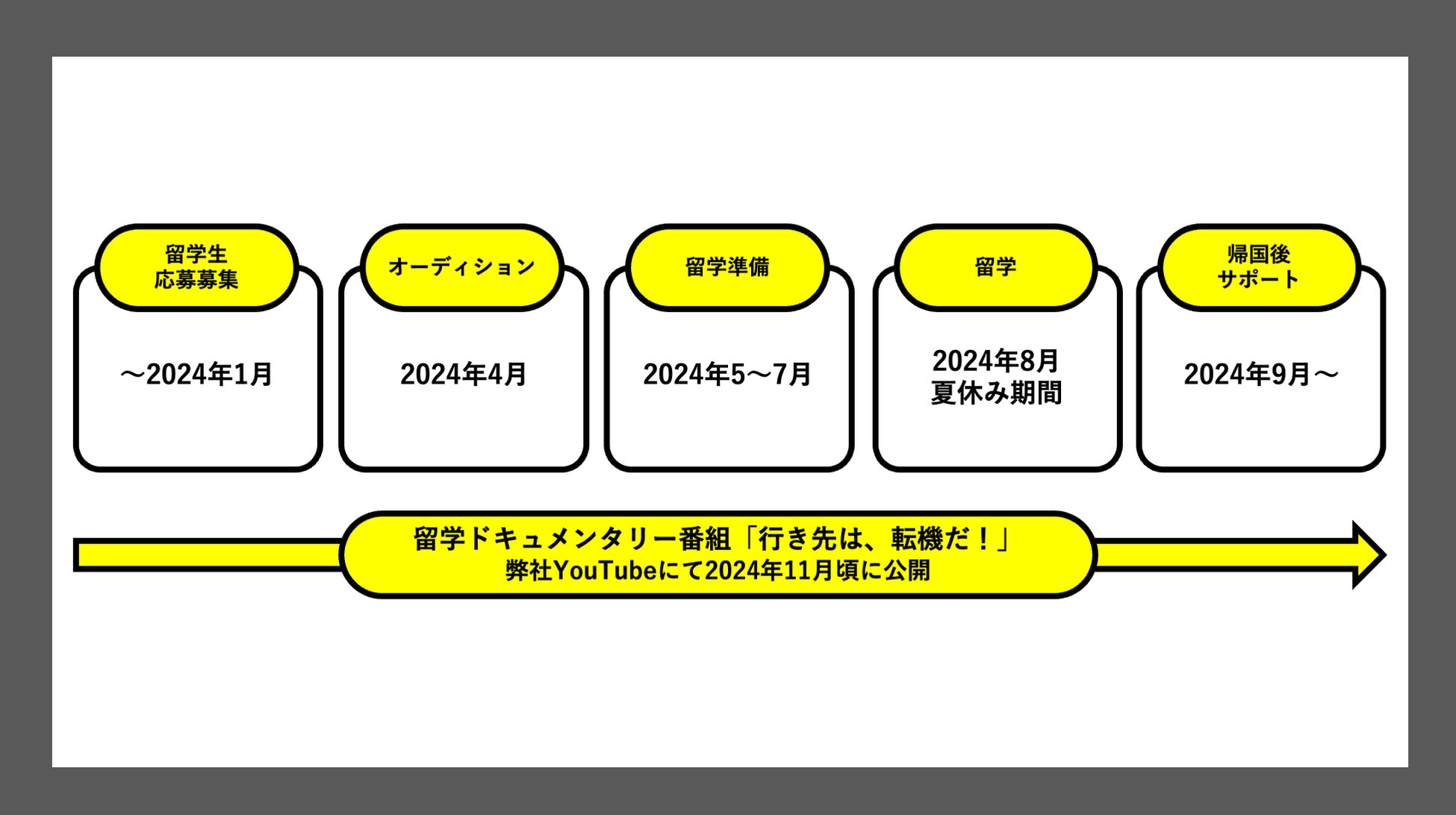 2024年1月より留学生募集のWebサイトを公開し、SNSにて各種募集コンテンツを展開し、3月まで募集をし4月に留学生の選考を行います。そこから留学準備をして、8月に2週間程度アメリカに留学します。また選考時からその様子を動画にして公開予定です。