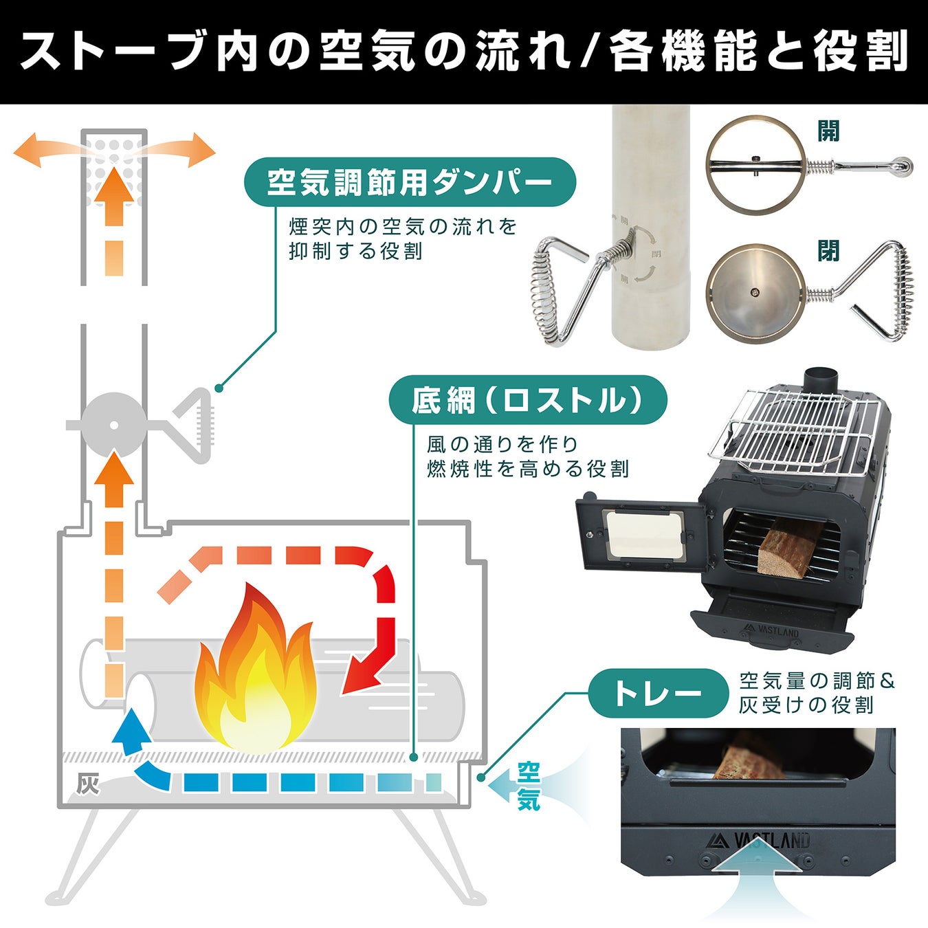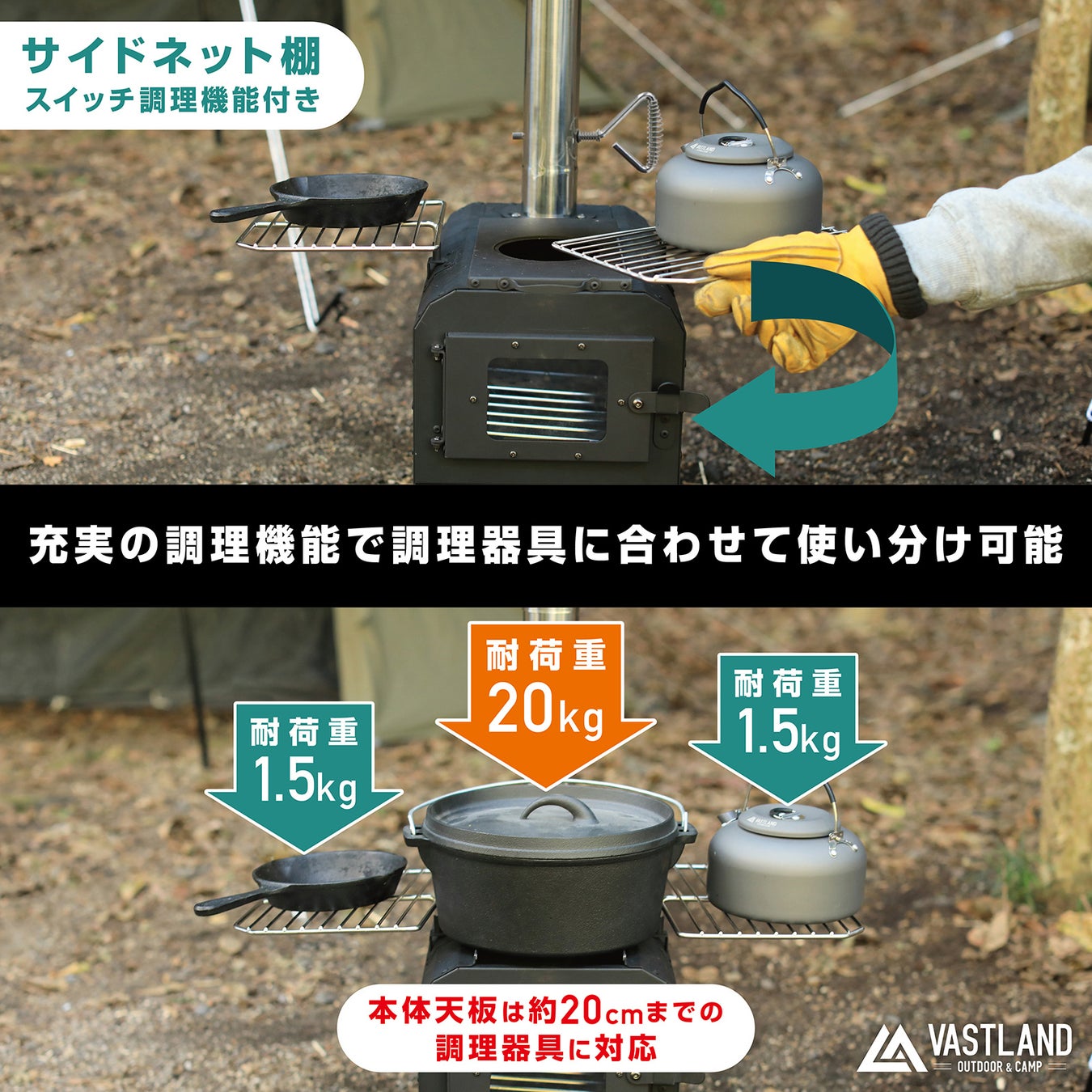 キャンプギアブランド「VASTLAND」、3面耐熱ガラス窓付きで調理機能が充実した「薪ストーブ」&「薪ストーブ 延長煙突 2本セット」を2023/10/7(土)に同時発売