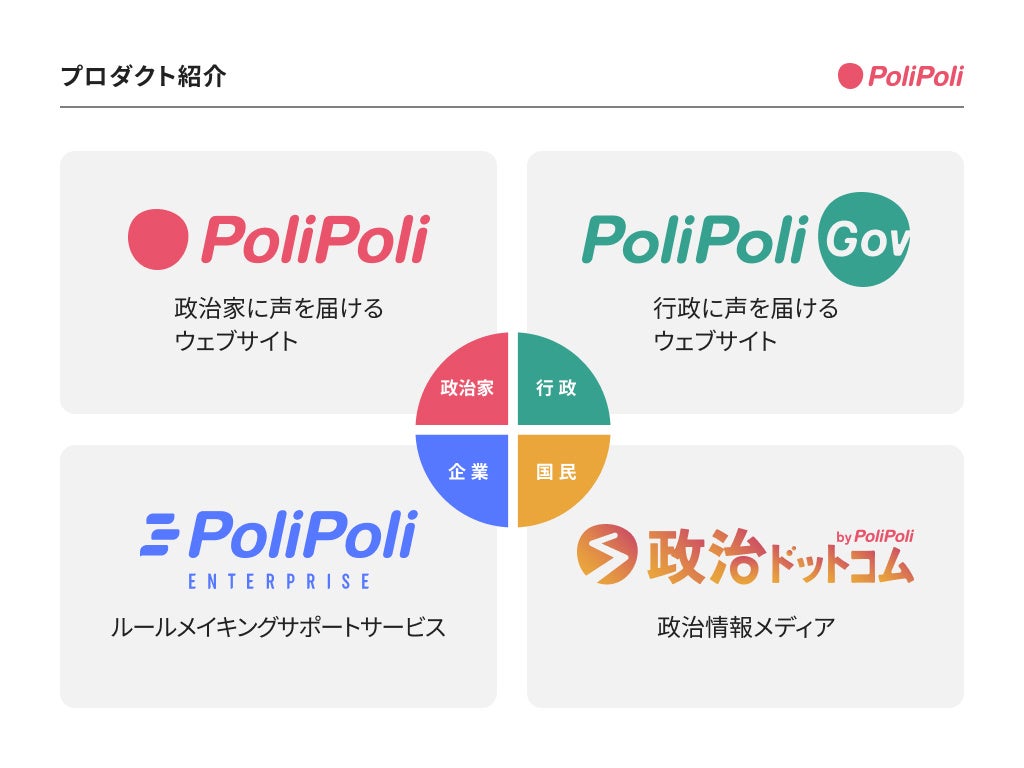 PoliPoliは2018年2月の創業以来、あらゆる人が政策づくりに参加できる社会を作るべく、プロダクトを開発・提供してきました。現在、政策づくりに関わる人々を広くカバーする4つのプロダクトを提供しており、ルールメイキングへ取り組む障壁を下げる新プロダクトも開発中です。