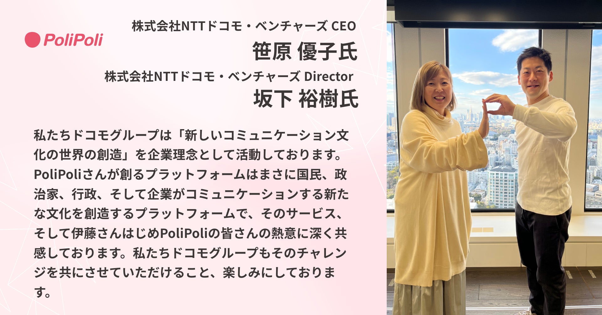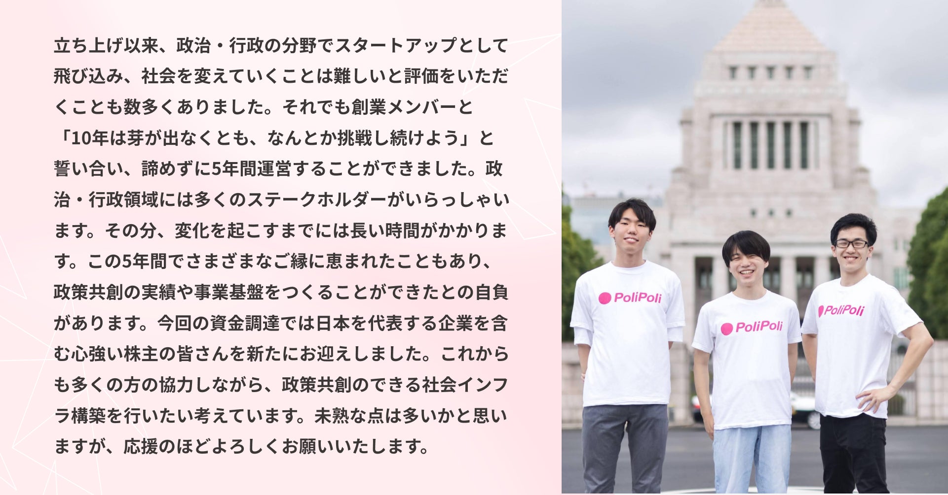 資金調達を通じて深化した強力なパートナーシップにより、社会インフラとなる新たな政治・行政プラットフォームの構築を推進してまいります。