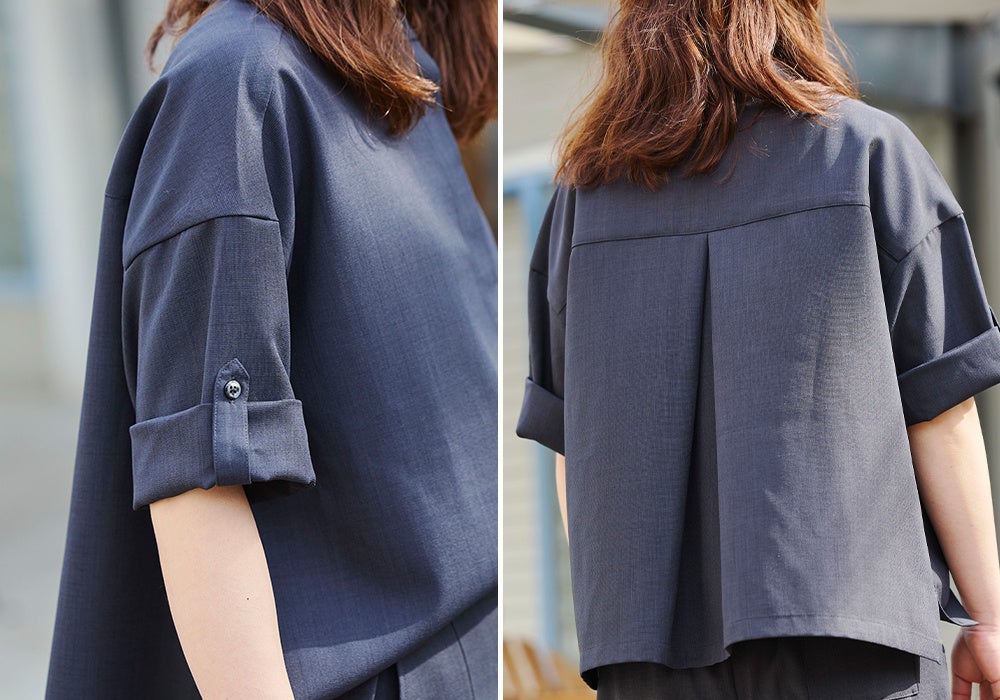 前立てはボタンを隠した比翼仕立てにし、よりスタイリッシュに仕上げました。肘までかかる丈の袖は、裏にロールアップ用のタブを付けることでコーディネートに合わせて調節が可能。
