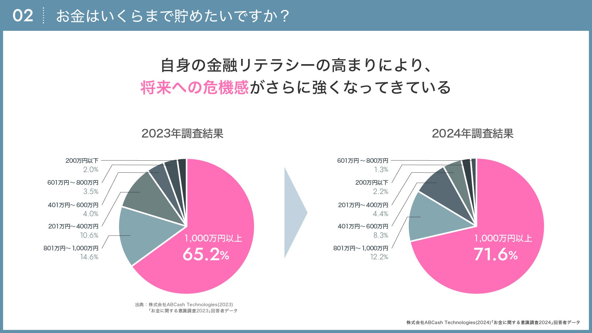 「お金はいくらまで貯めたいか?」という問いに対して「1,000万円以上貯めたい」と回答した割合が、昨年に比べて7.0ポイント高まる71.6%となりました。