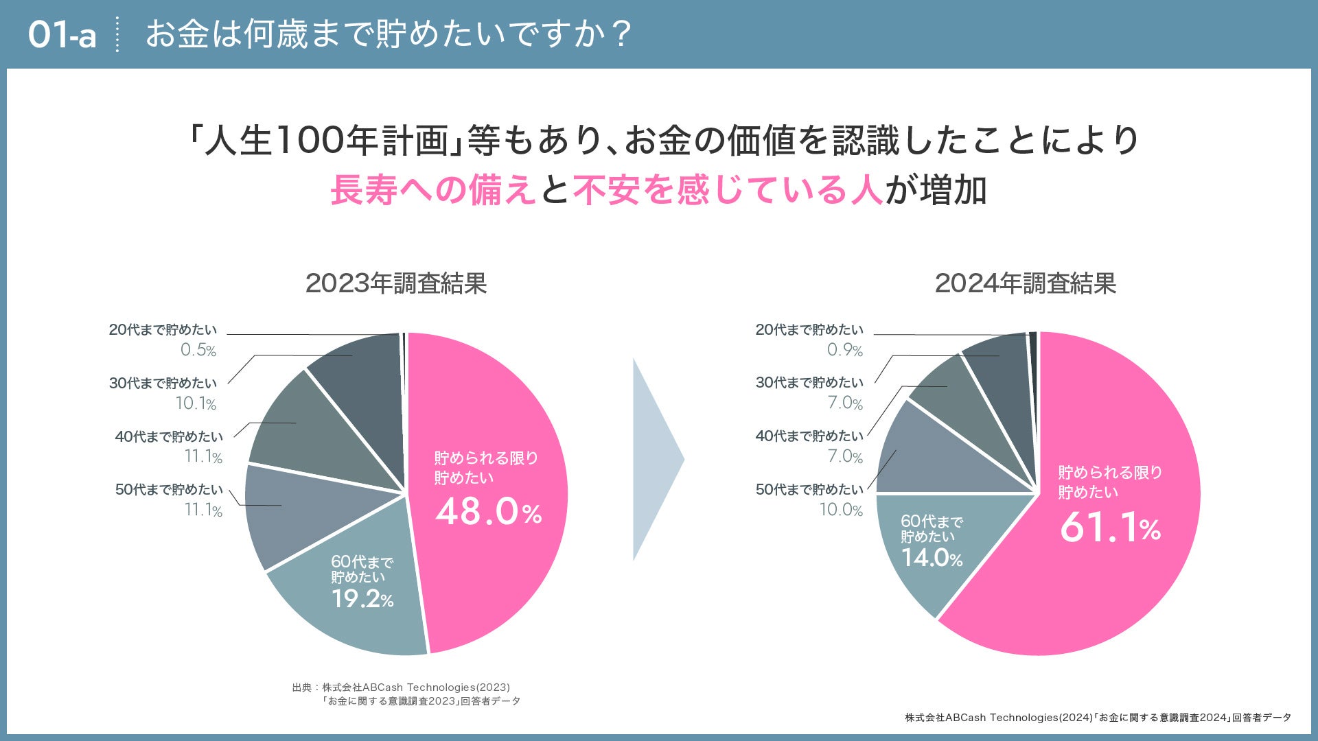 昨年実施した「お金に関する意識調査2023」では、「1,000万円以上貯めたい」と回答したのが全体の48.0%だったのに対して、今年の調査では61.1%と13.1ポイント改善しました。