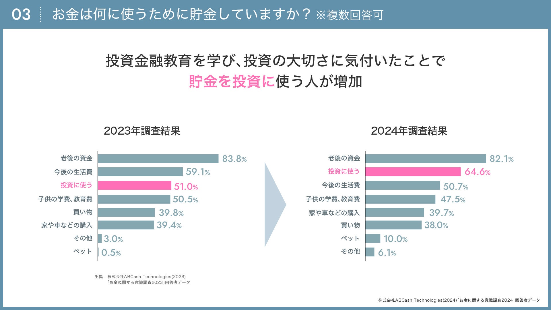 一方で、貯金を「投資に使う」と回答した人の割合は、2023年に比べて51.0%から64.6%と13.6ポイント上昇しています。