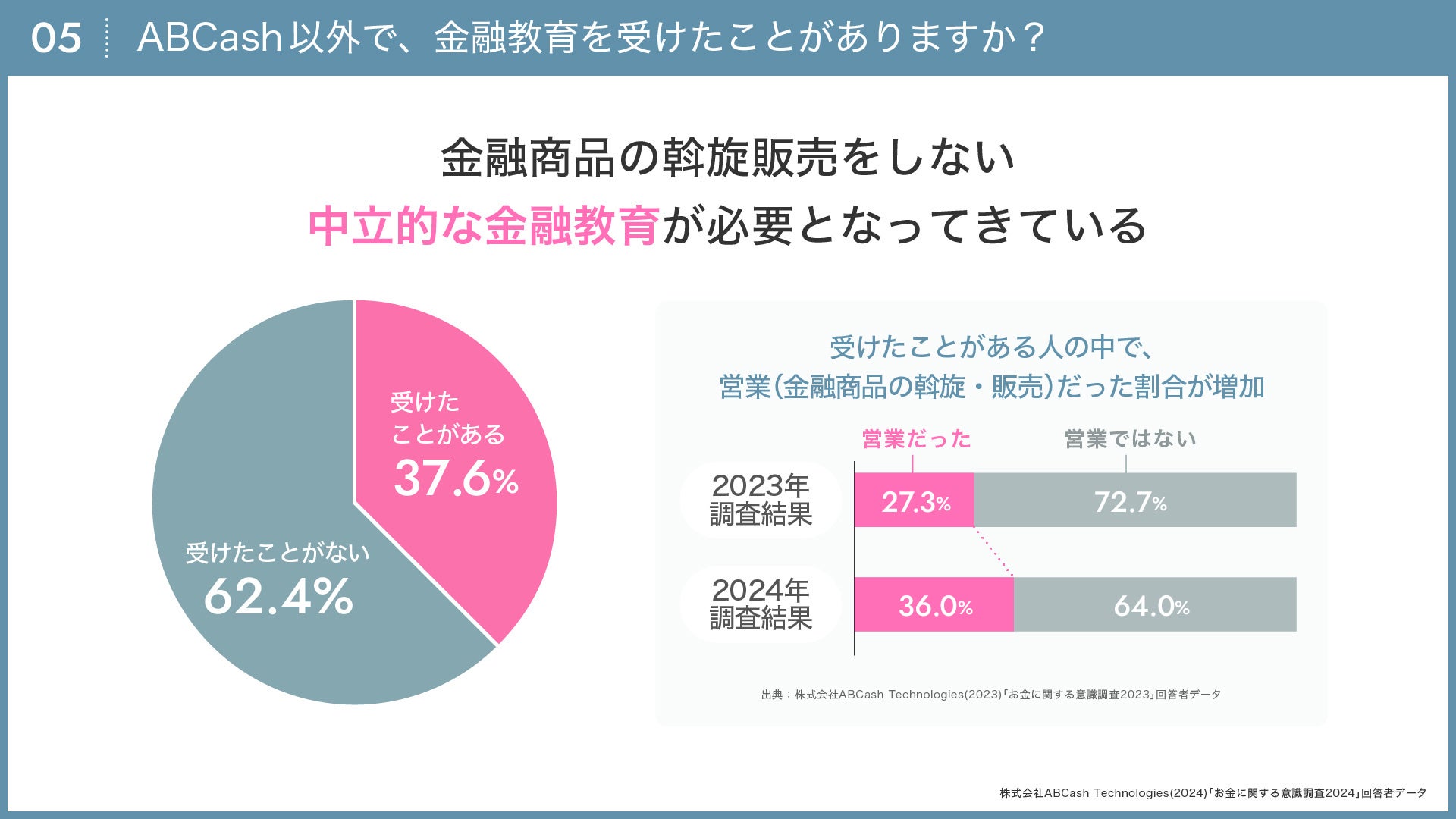 5.2024年は金融教育を受けた人が増加したものの、営業活動を含む金融教育の割合も増加。