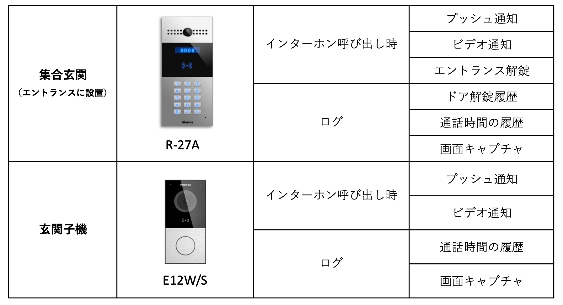 この度のAKUVOX社インターホンとの連携によって、「SpaceCore」アプリから以下の操作が可能となります。また、今後はエントランスの顔認証解錠や戸建住宅のインターホン連携も開発予定です。