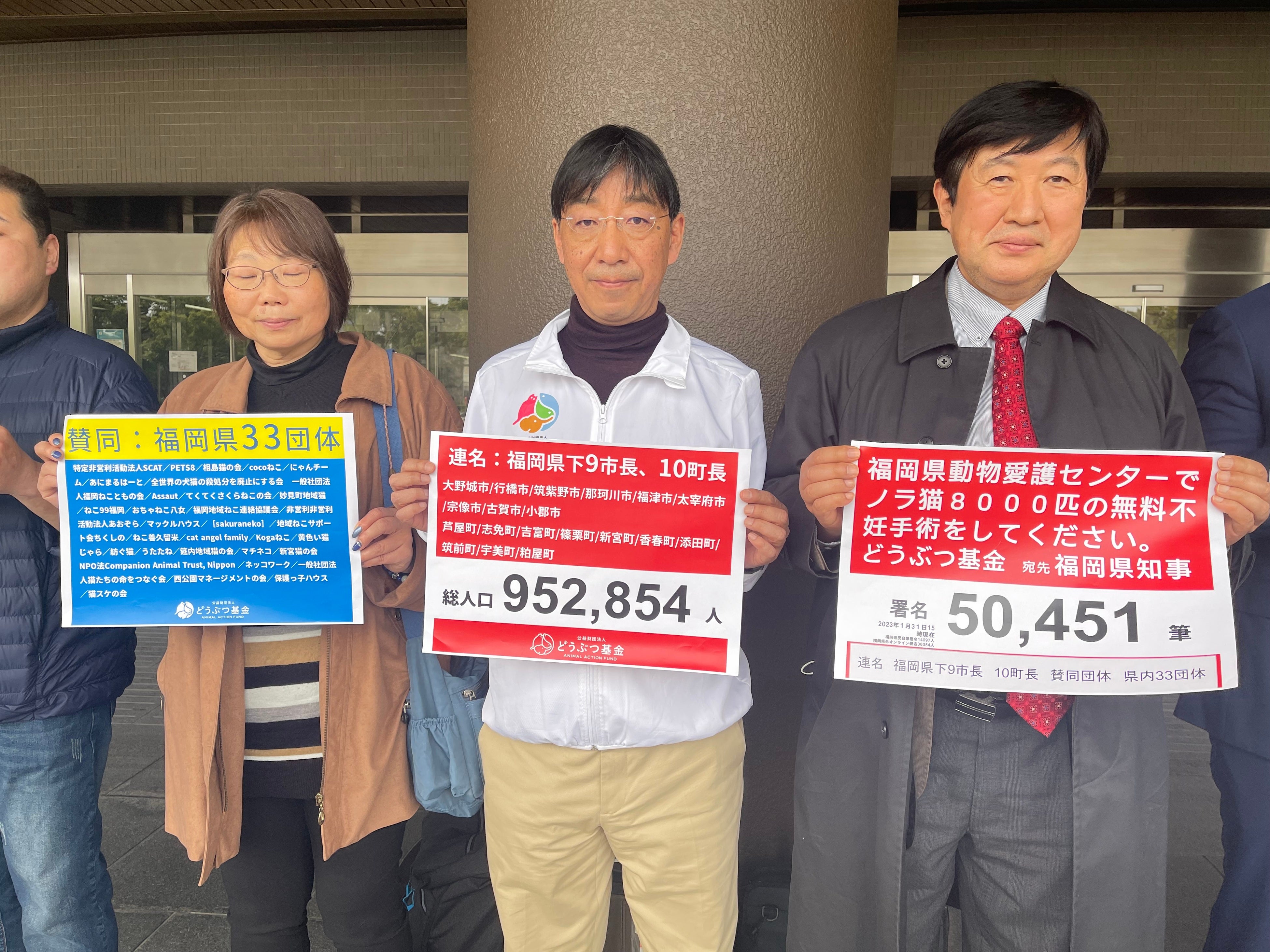 福岡県 ねこ殺処分ゼロへ 100万人の願い「殺処分ゼロのために動物愛護センターで野良猫8,000頭の無料不妊手術をしてください」要望書、署名を提出。 どうぶつ基金
