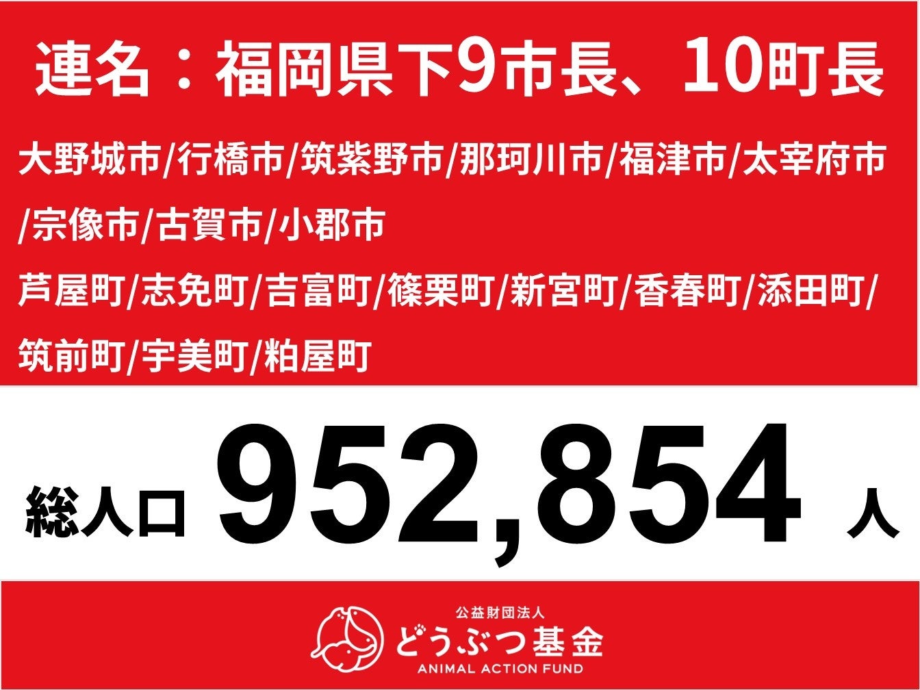 犬や猫の殺処分ゼロを目指す公益財団法人どうぶつ基金は、服部 誠太郎福岡県知事と桐明 和久福岡県議会議長あてに要望書と署名を提出しました。要望書は、日本獣医師会前会長の山根義久氏、福岡大学教授の山﨑 好裕氏、弁護士の朝隈朱絵氏のほか、県内19市町(総人口95万人超)の首長が連名し、署名5万筆とあわせ福岡県民約100万人の願いが届けられました。