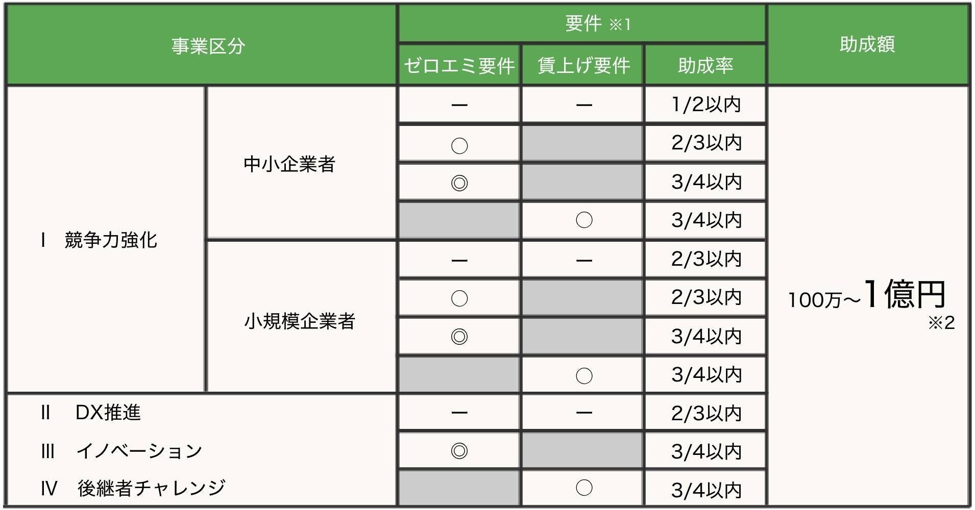 今年度からすべての事業区分で「ゼロエミッション要件」「賃上げ要件」の適用が可能となります。要件適用により、助成率を最大3/4以内に拡充します。