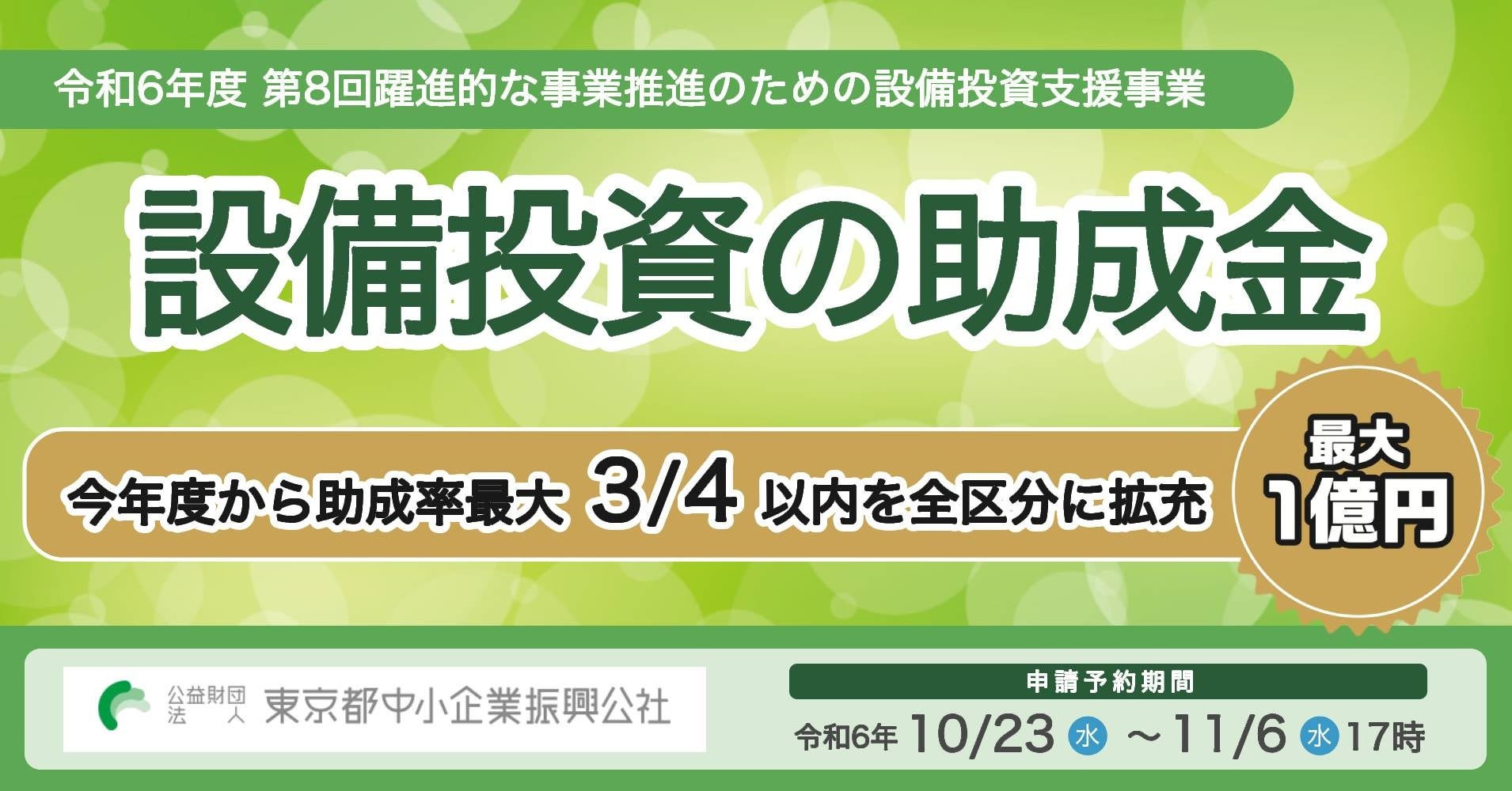 公益財団法人 東京都中小企業振興公社(本社:東京都千代田区、理事長:中西 充)では、都内中小企業の中長期的な成長を支え、東京の産業力の強化及び都内経済の持続的発展につなげていくことを目的として「躍進的な事業推進のための設備投資支援事業(第8回)」の申請予約を10月23日(水)から受け付けます。
