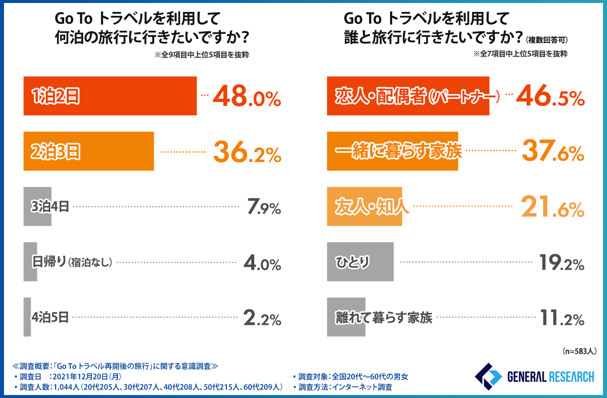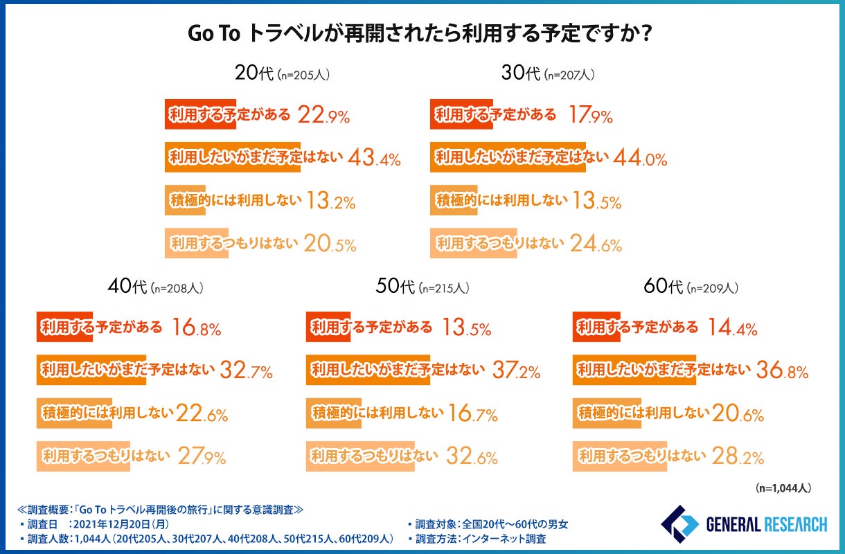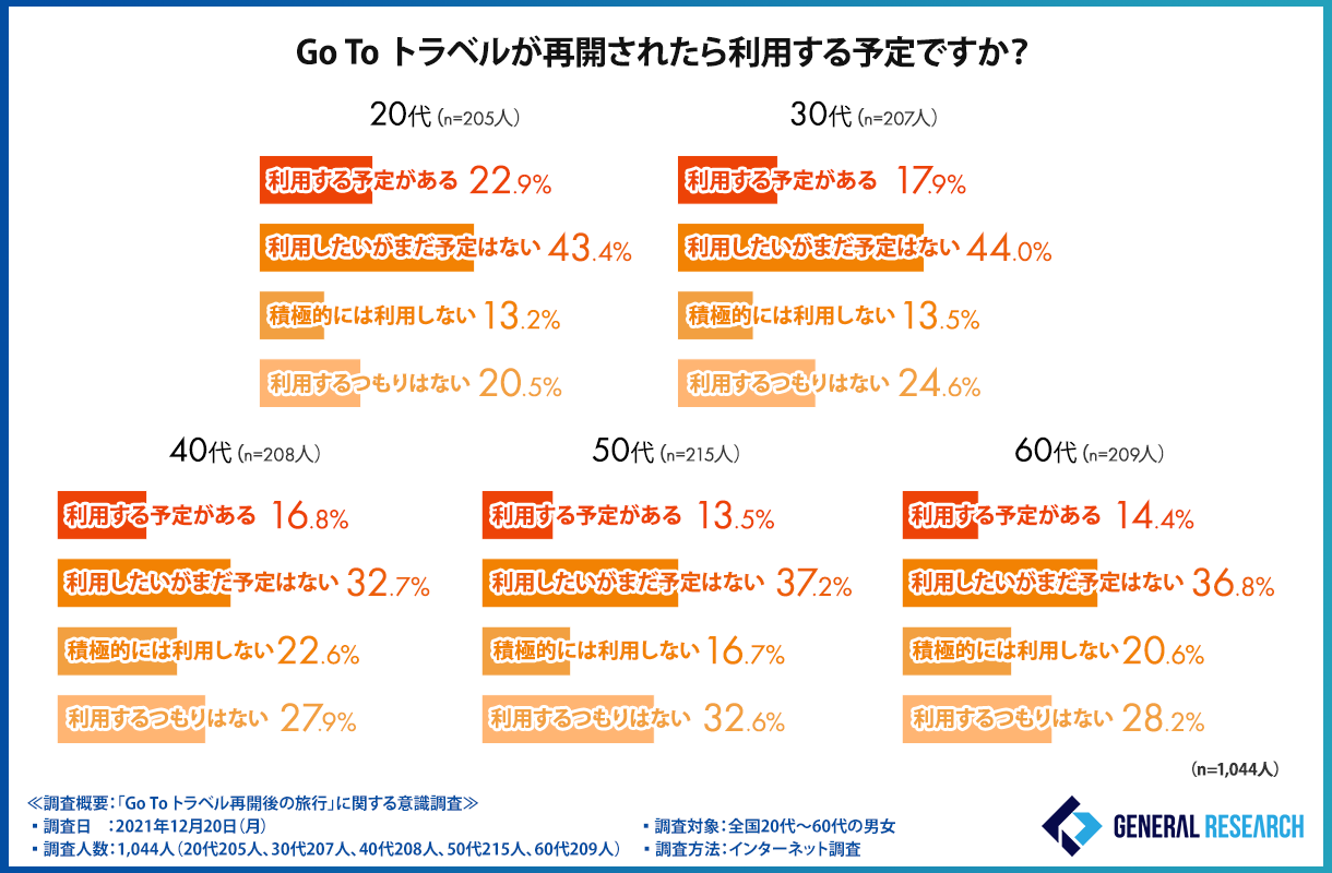 この度、ゼネラルリサーチ株式会社(代表取締役:五條 寿朗、本社:東京都渋谷区)は、全国20代~60代の男女1,044人を対象に、「Go To トラベル再開後の旅行」に関する意識調査を実施しました。