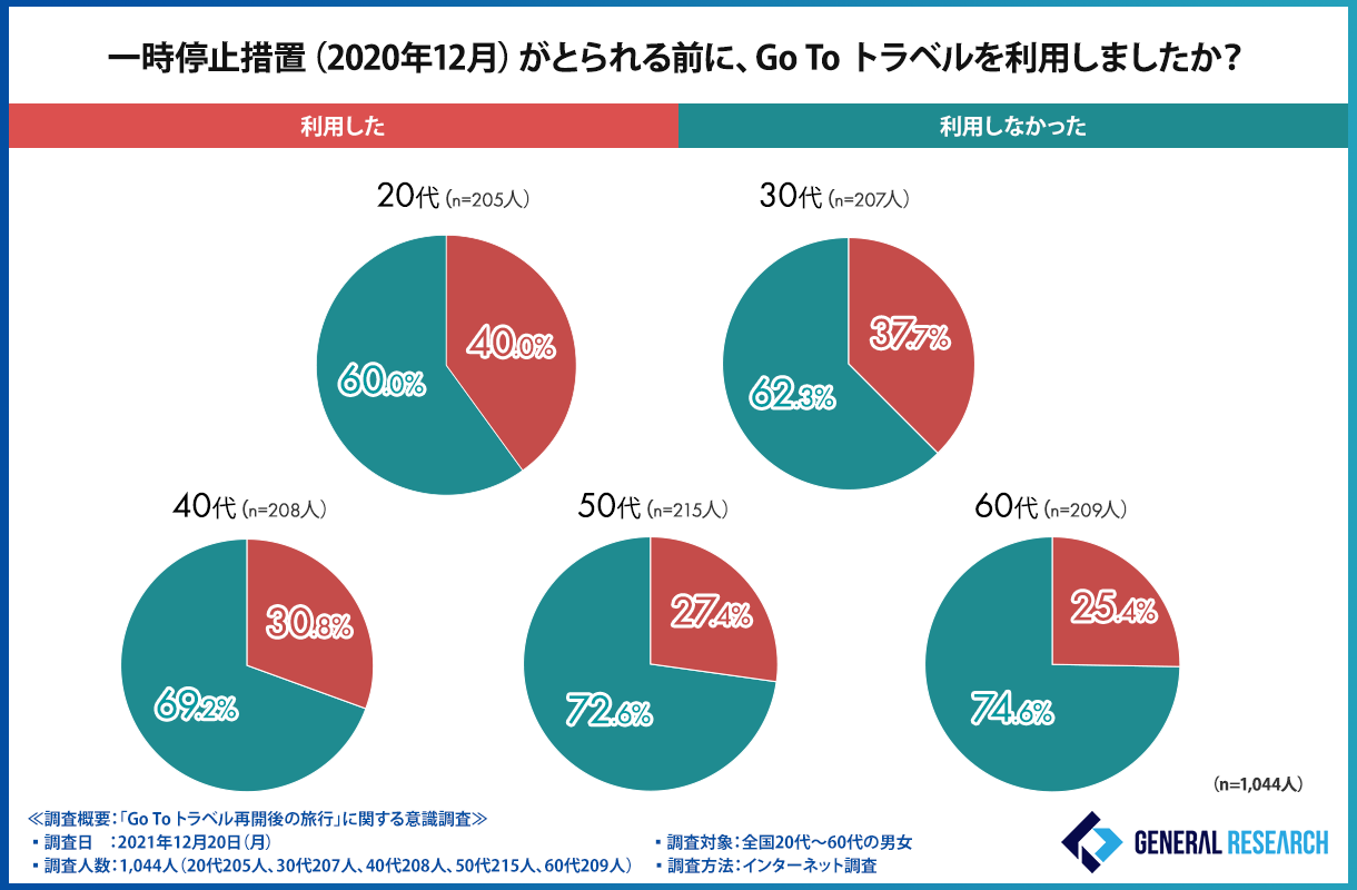 - 年代別|停止前のGo To トラベル利用状況…利用しなかった方が過半数。年代が上がるほどその割合も高まる結果に
