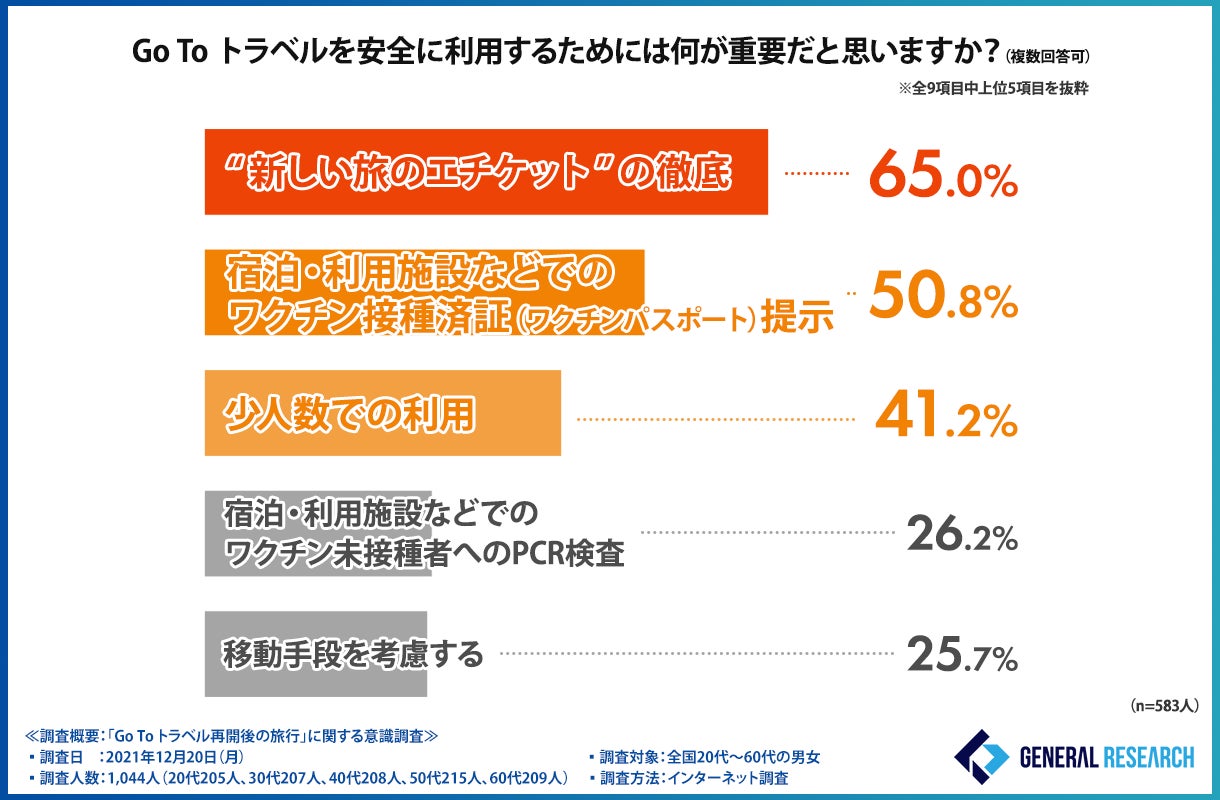 そこで、「Go To トラベルを安全に利用するためには何が重要だと思いますか?(複数回答可)」と質問したところ、『“新しい旅のエチケット”の徹底(65.0%)』という回答が最も多く、以降『宿泊・利用施設などでのワクチン接種済証(ワクチンパスポート)提示(50.8%)』『少人数での利用(41.2%)』『宿泊・利用施設などでのワクチン未接種者へのPCR検査(26.2%)』『移動手段を考慮する(25.7%)』『時期を考慮する(24.5%)』『行き先を考慮する(20.8%)』『宿泊先の事前確認(HP、問い合わせなど)(16.1%)』と続きました。