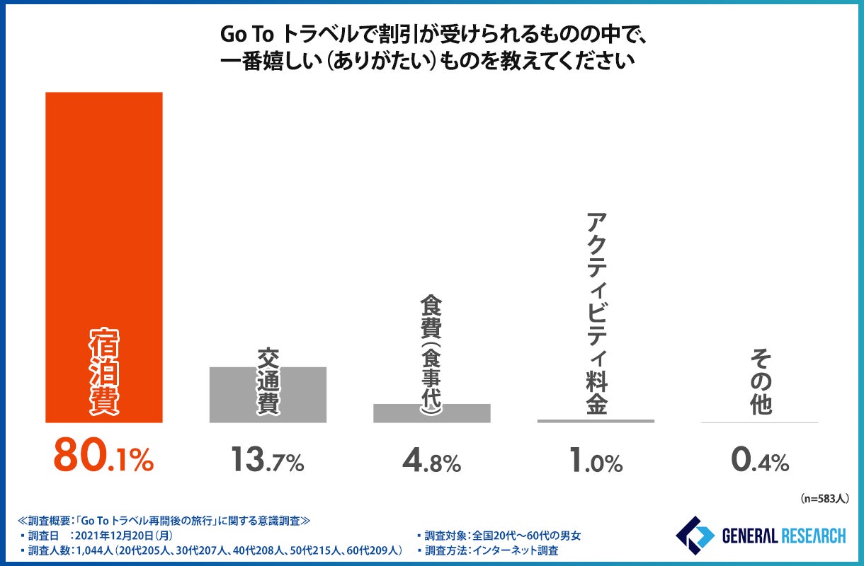 そこで、「Go To トラベルで割引が受けられるものの中で、一番嬉しい(ありがたい)ものを教えてください」と質問したところ、『宿泊費(80.1%)』『交通費(13.7%)』『食費(食事代)(4.8%)』『アクティビティ料金(スポーツ体験、陶芸体験、いちご狩りなどの体験型アクティビティ)(1.0%)』という結果となり、8割の方が、日帰り旅行での割引ではなく、宿泊を伴う旅行での宿泊費が割引を受けることが一番嬉しいと思っていることが分かりました。
